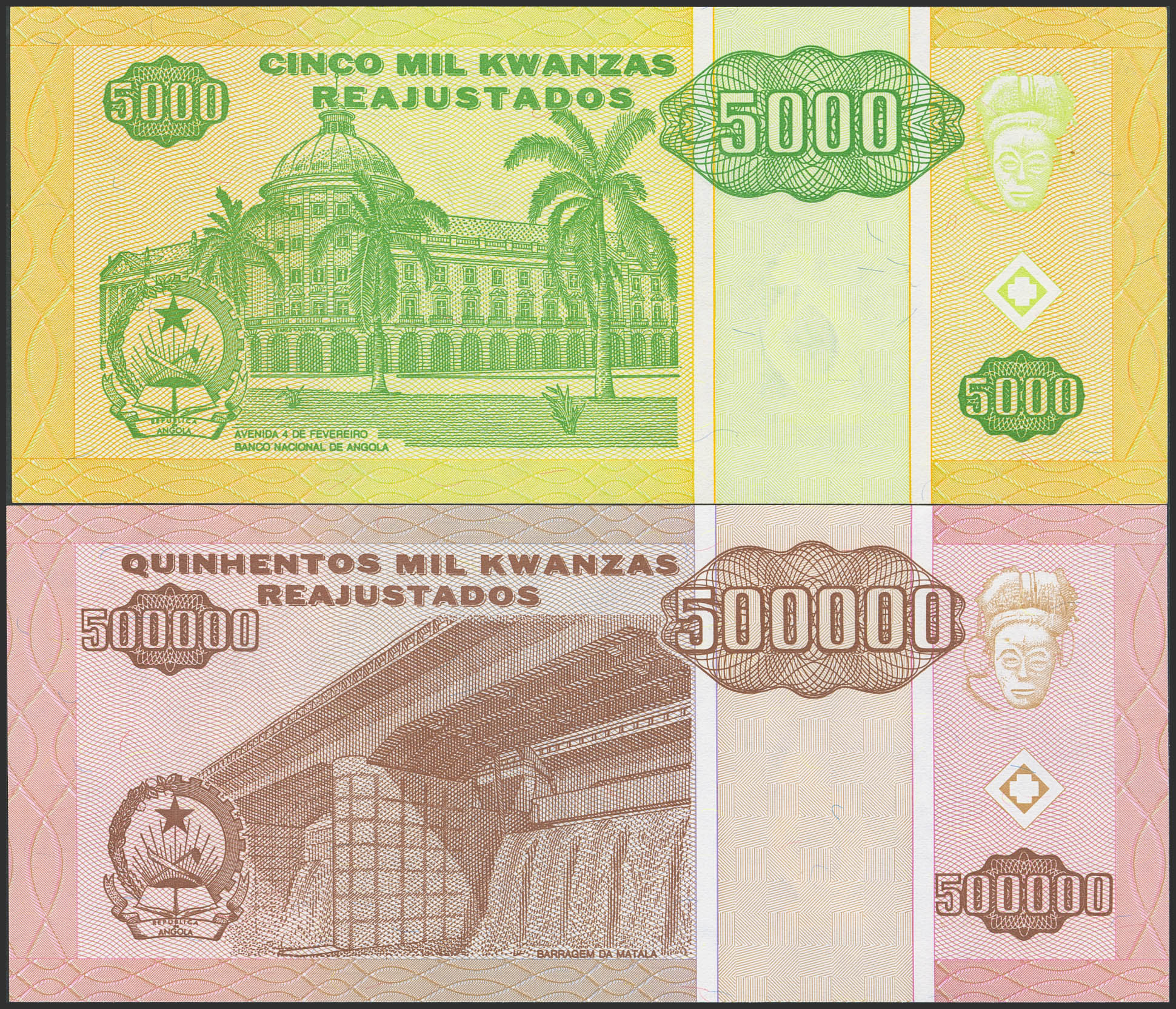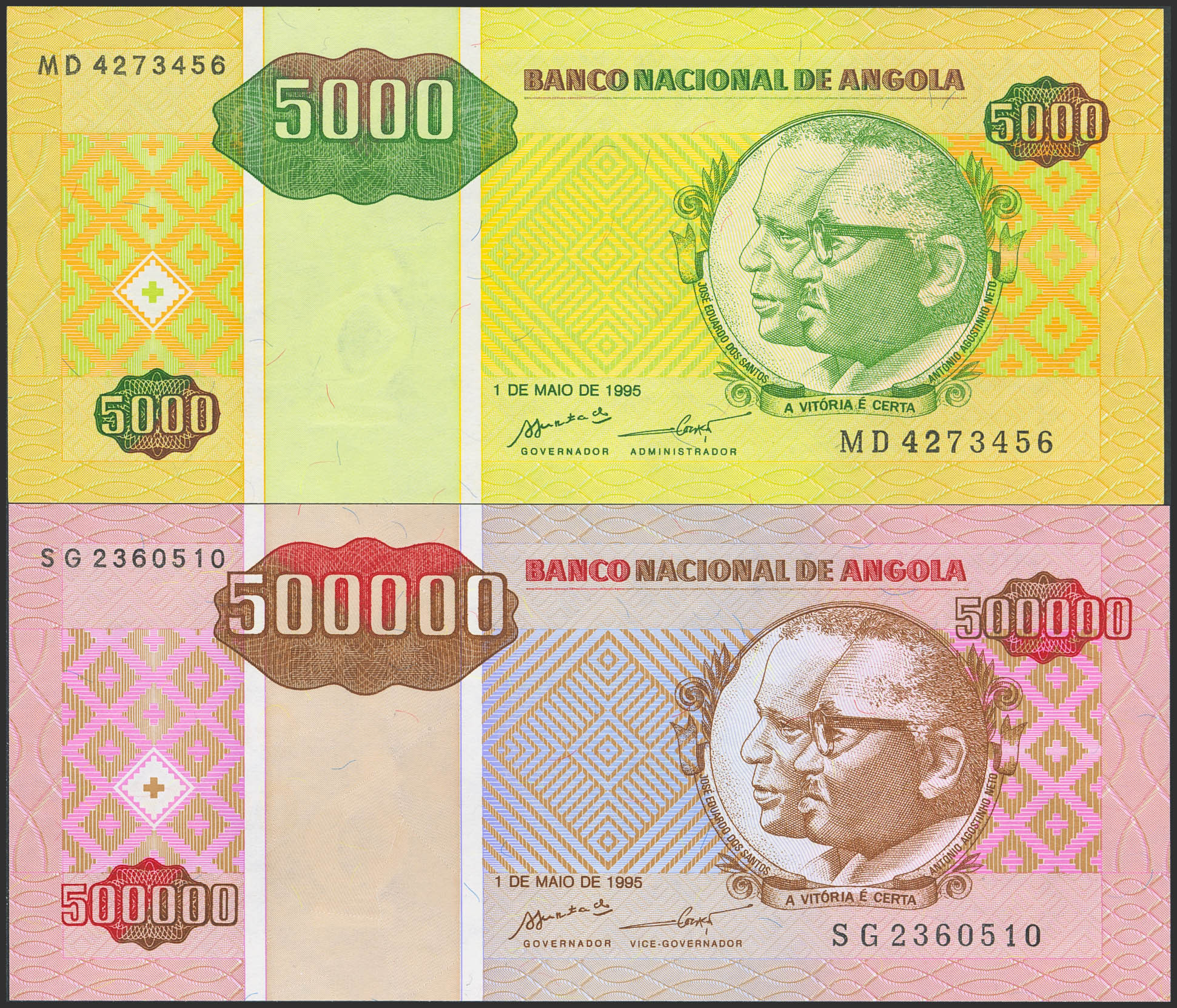 ANGOLA. Lot of 2 notes of 5000 and 500000 Kwanzas. 1 May 1995. Banco Nacional. (Pick: 136, 140). Uncirculated.