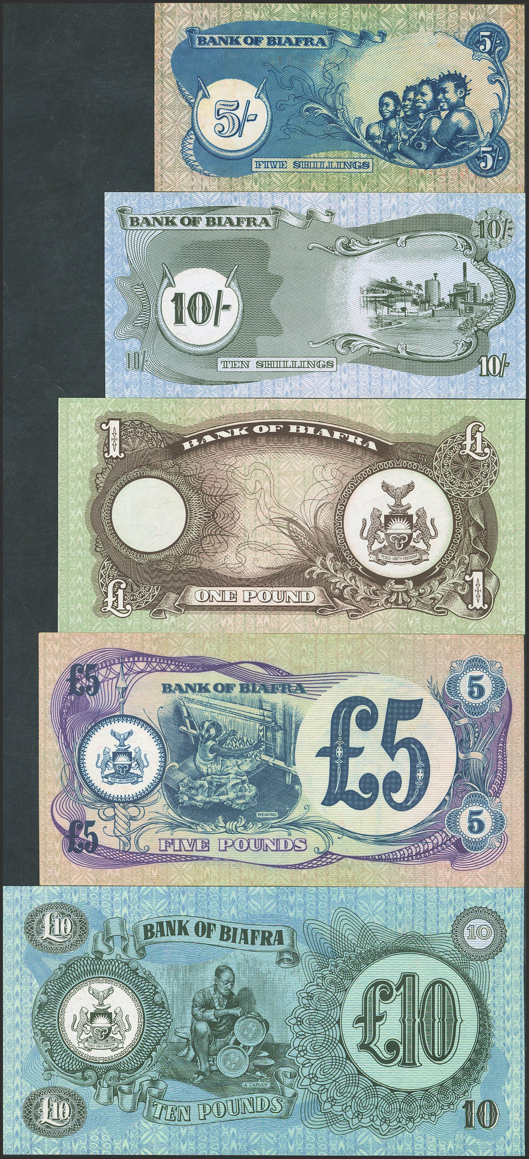 BIAFRA. Complete set of 5 notes from 5 Shillings to 10 Pounds. (1969ca). Bank of Biafra. (Pick: 3a, 4, 5a, 6a, 7b). More than Extremely Fine (2) and Uncirculated (3).
