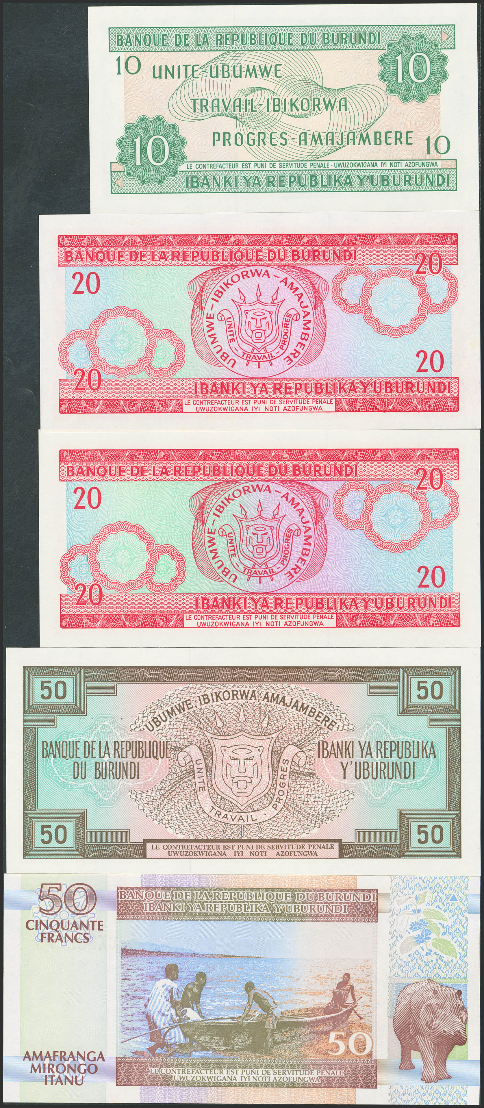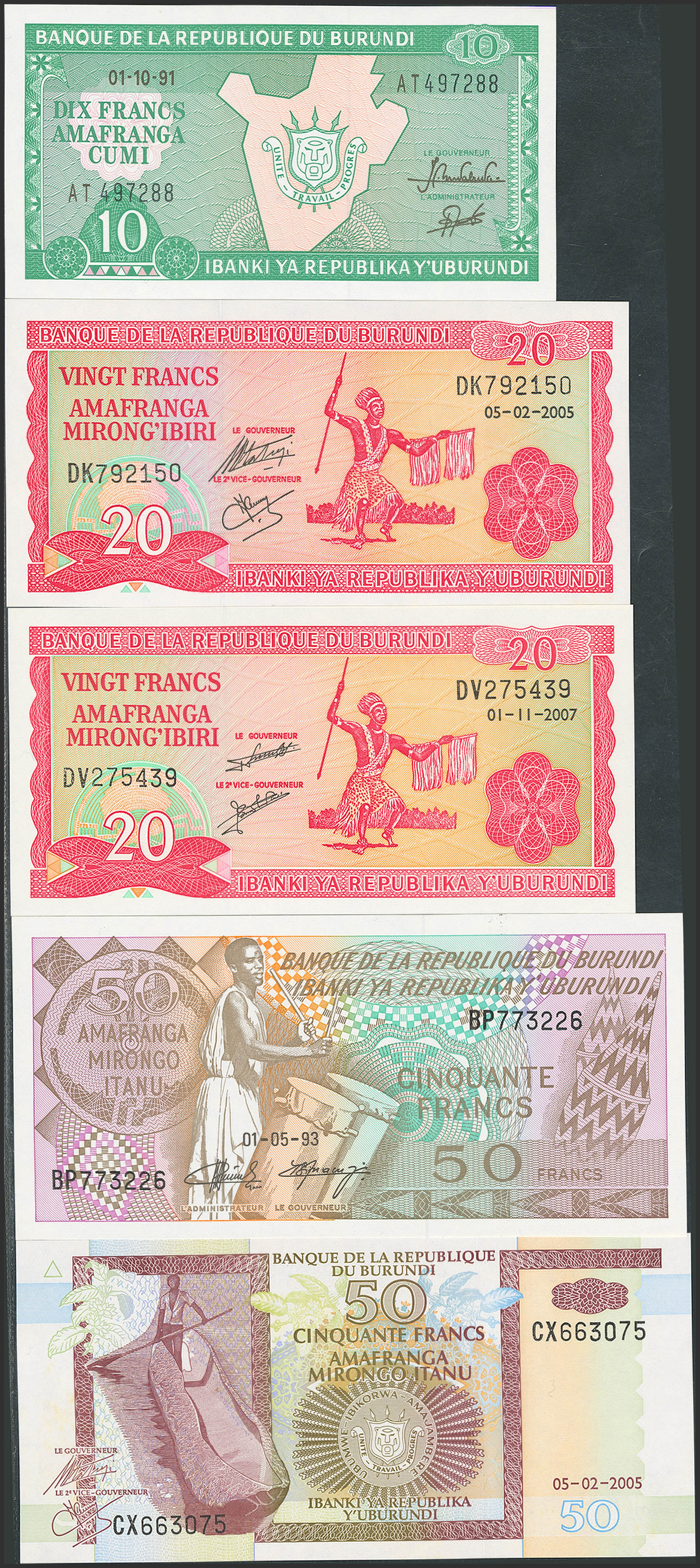 BURUNDI. Lot of 5 notes of 10, 20 and 50 Francs. 1991 to 2007. Banque de la Republique. (Pick: 33b, 27d(2), 28c, 36e). Uncirculated.