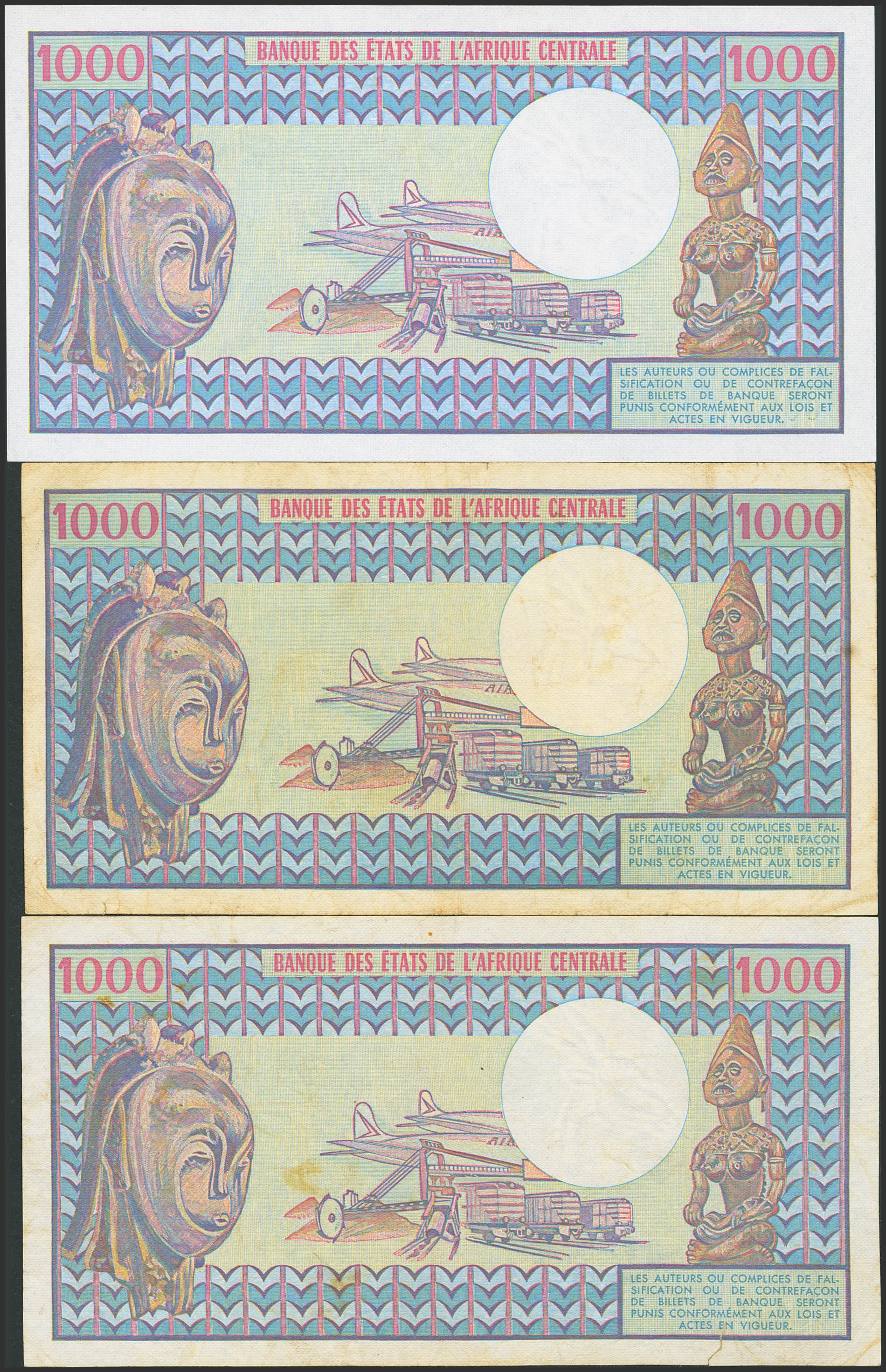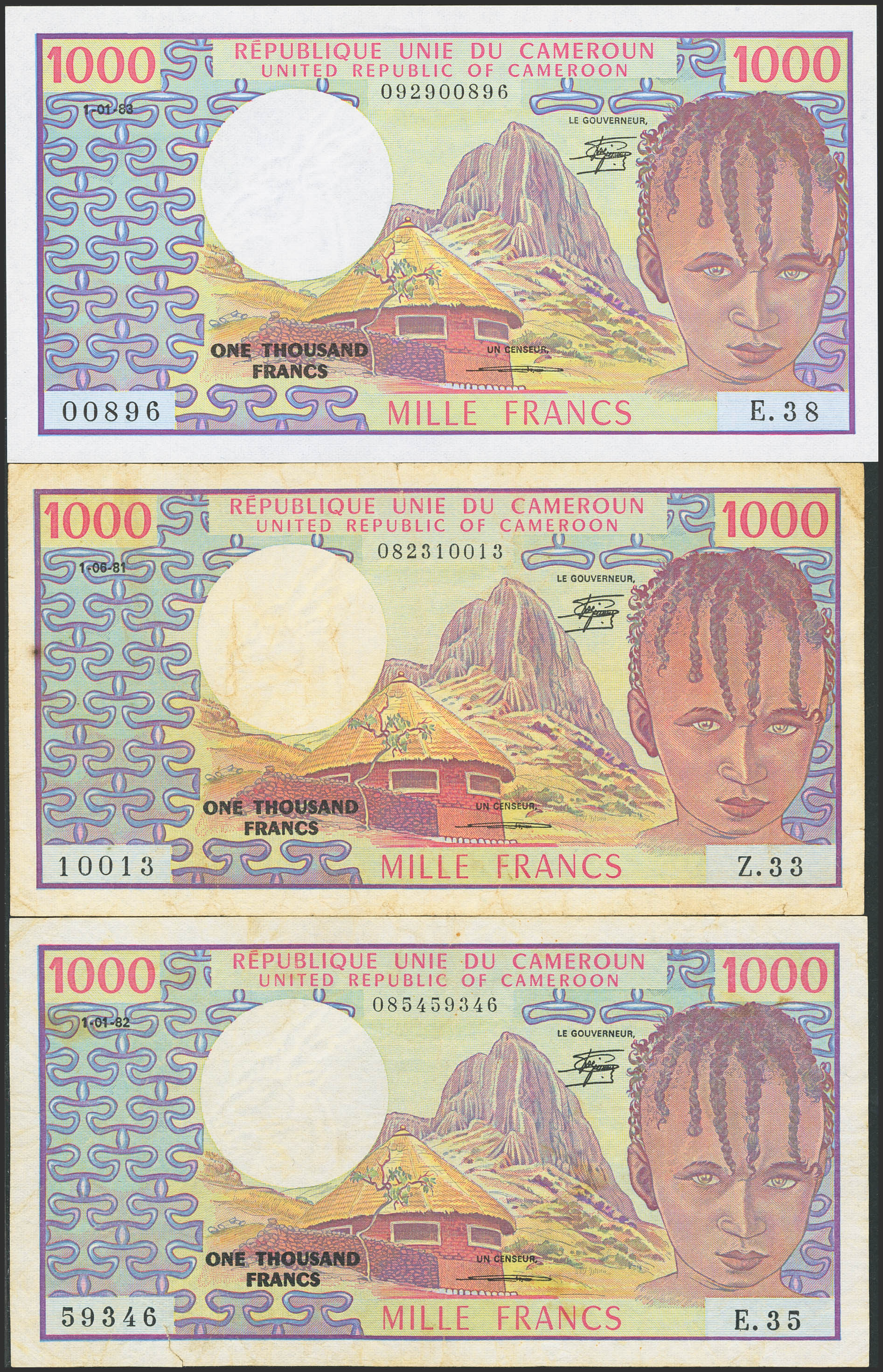 CAMEROON. Lot of 3 notes of 1000 Francs. 1981 to 1983. Banque des Etats de l'Afrique Centrale. (Pick: 16d). Very Fine with tears (2) and Less than Uncirculated (1).