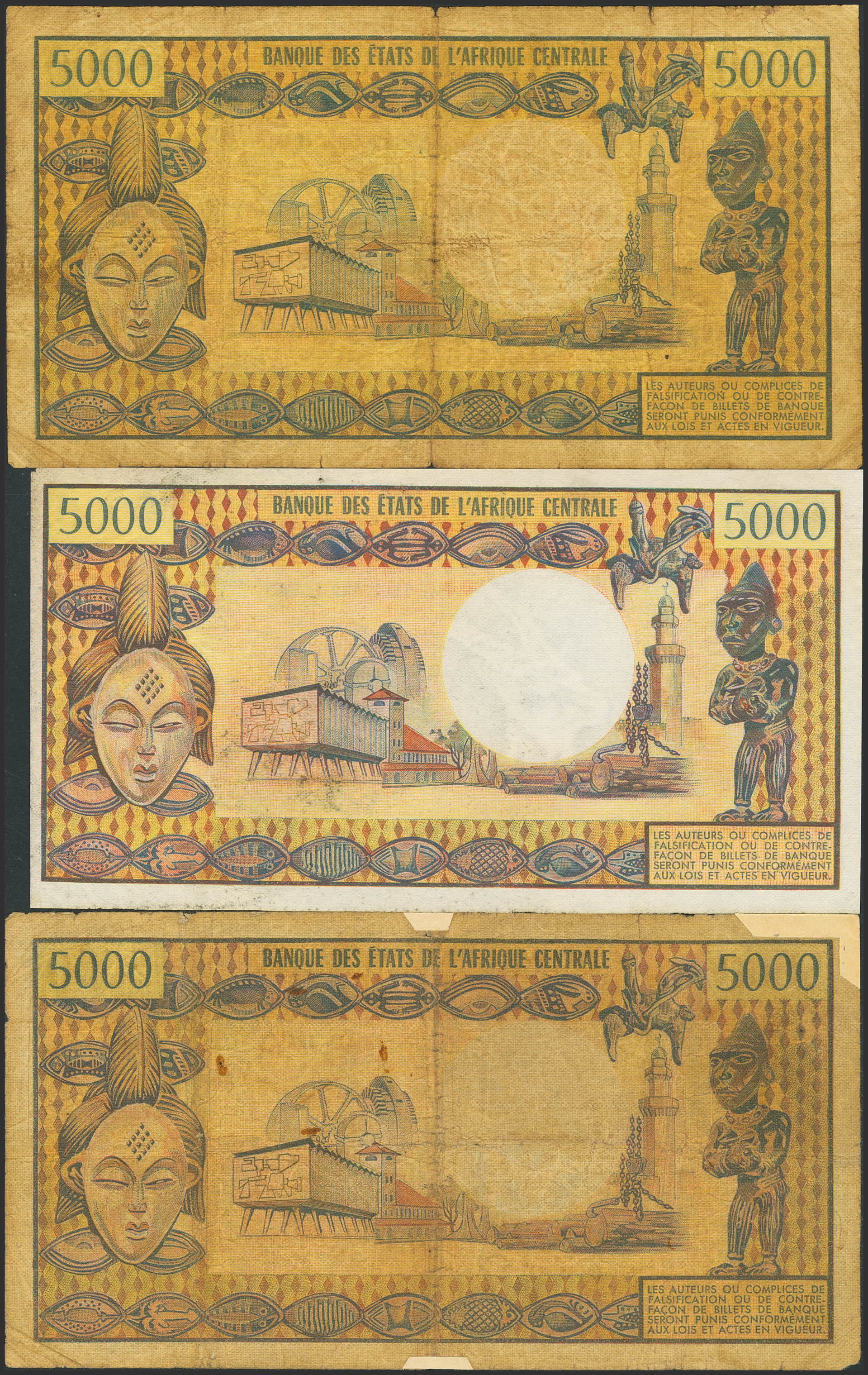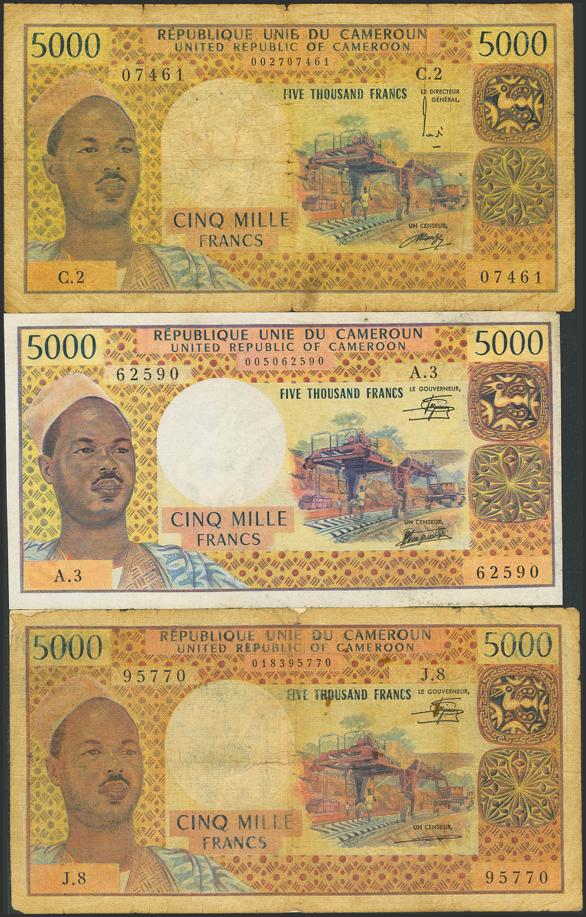 CAMEROON. Lot of 3 notes of 5000 Francs. (1974ca). Banque des Etats de l'Afrique Centrale. (Pick: 17b, 17c(2)). The notes in fine condition have tears, and one of them has adhesive paper added over them. Fine (2), Almost Uncirculated (1).