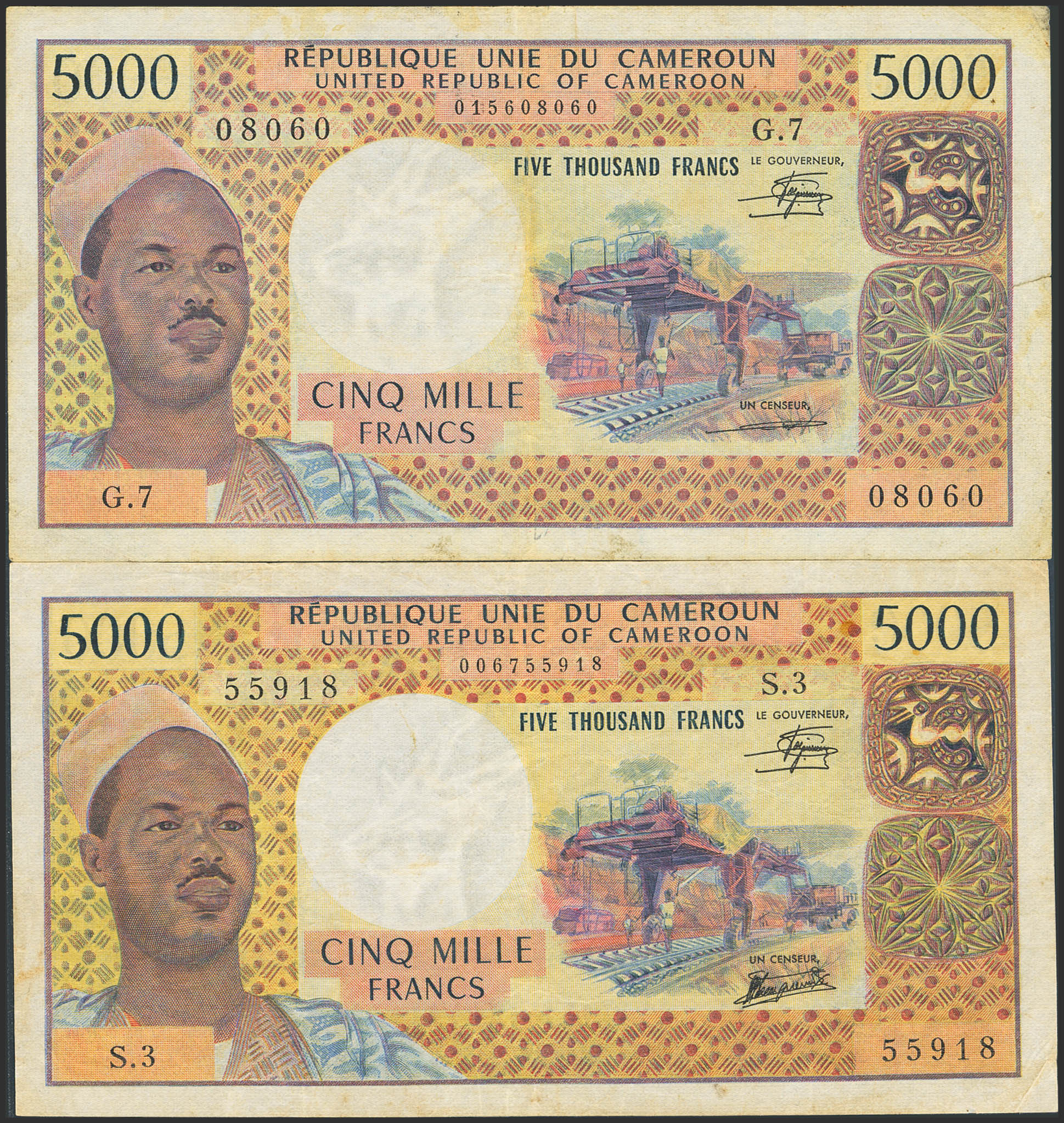 CAMEROON. Lot of 2 notes of 5000 Francs. (1974ca). Banque des Etats de l'Afrique Centrale. (Pick: 17c). More than Very Fine.