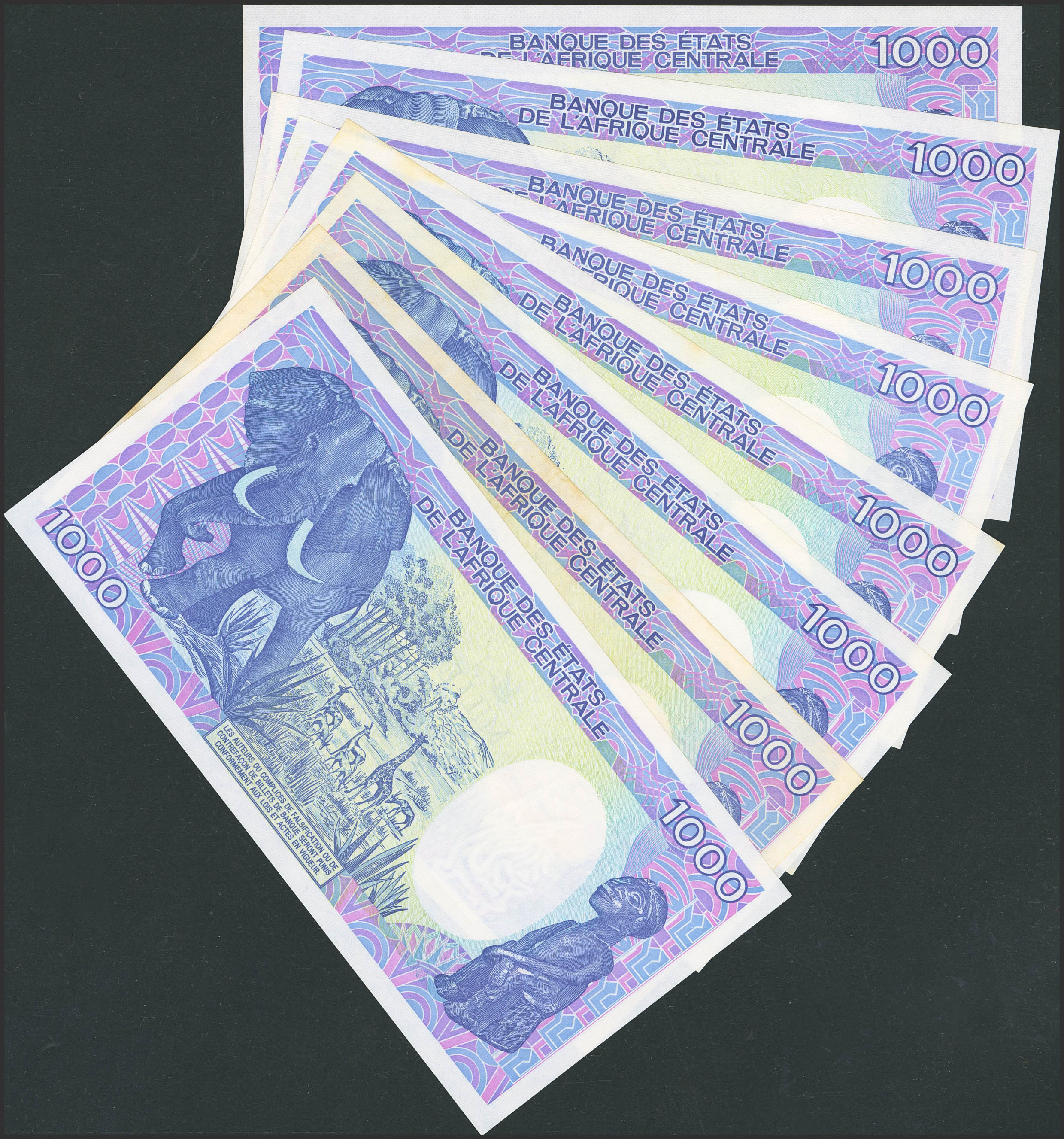 CAMEROON. Lot of 8 notes of 1000 Francs. January 1 from 1986 to 1992. Banque des Etats de l'Afrique Centrale. Republique du Cameroun. (Pick: 26a(4), 26b(1), 26c(3)). Extremely Fine with stains (1), Less than Uncirculated (1) and Uncirculated (5).