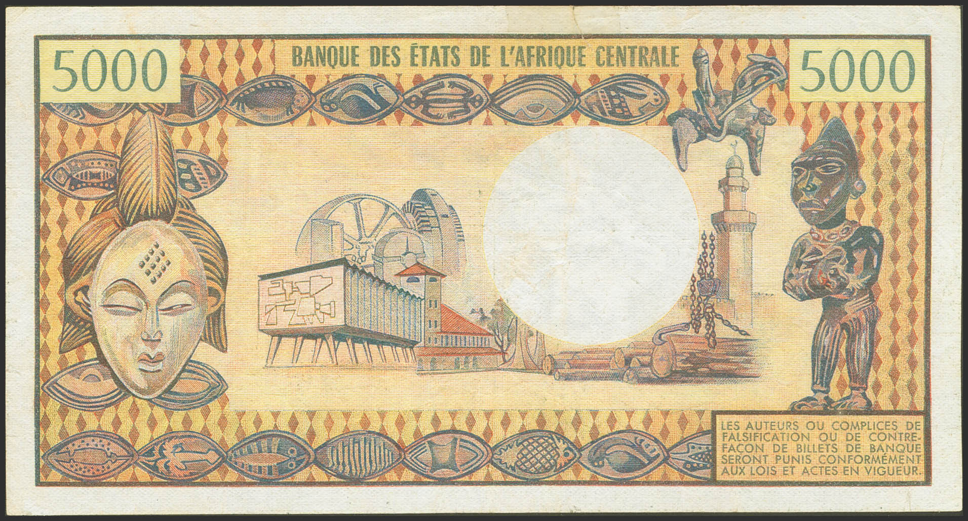 CENTRAL AFRICAN REPUBLIC. 5000 Francs. (1979ca). Banque des Etats de l'Afrique Centrale. Empire. (Pick: 7). Repaired. Very Fine.