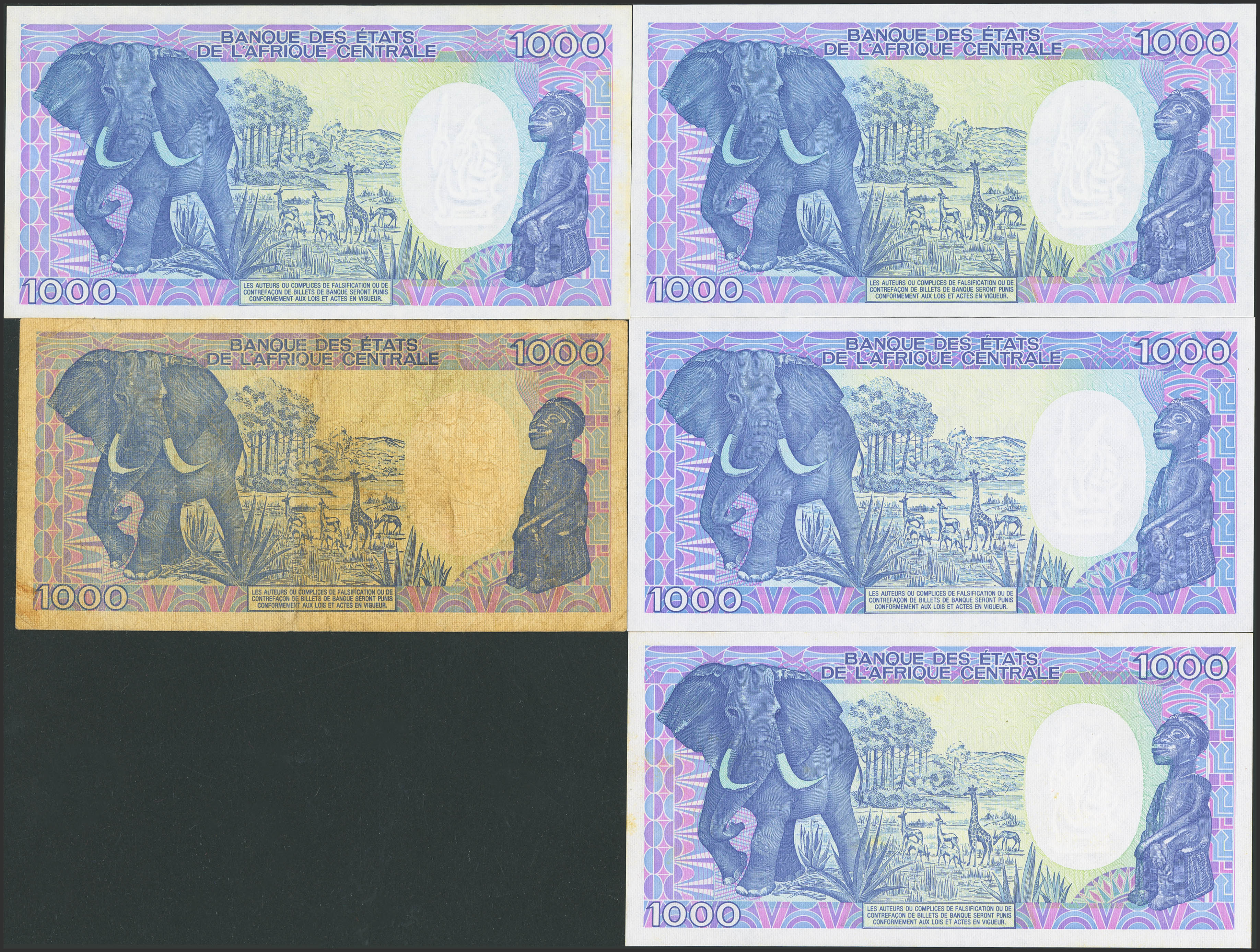 CENTRAL AFRICAN REPUBLIC. Lot of 5 notes of 1000 Francs. January 1 from 1986 to 1990. Banque des Etats de l'Afrique Centrale. Republique Centrafricaine. (Pick: 16). Fine (1), Less than Uncirculated (2) and Uncirculated (2).