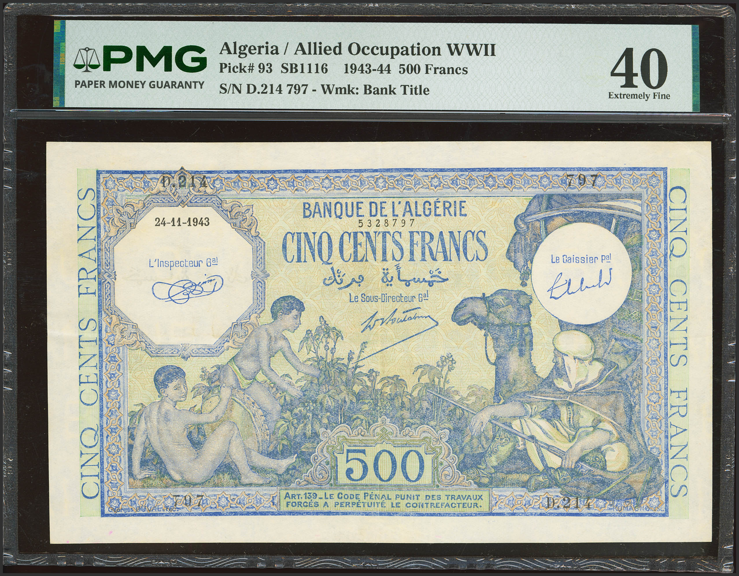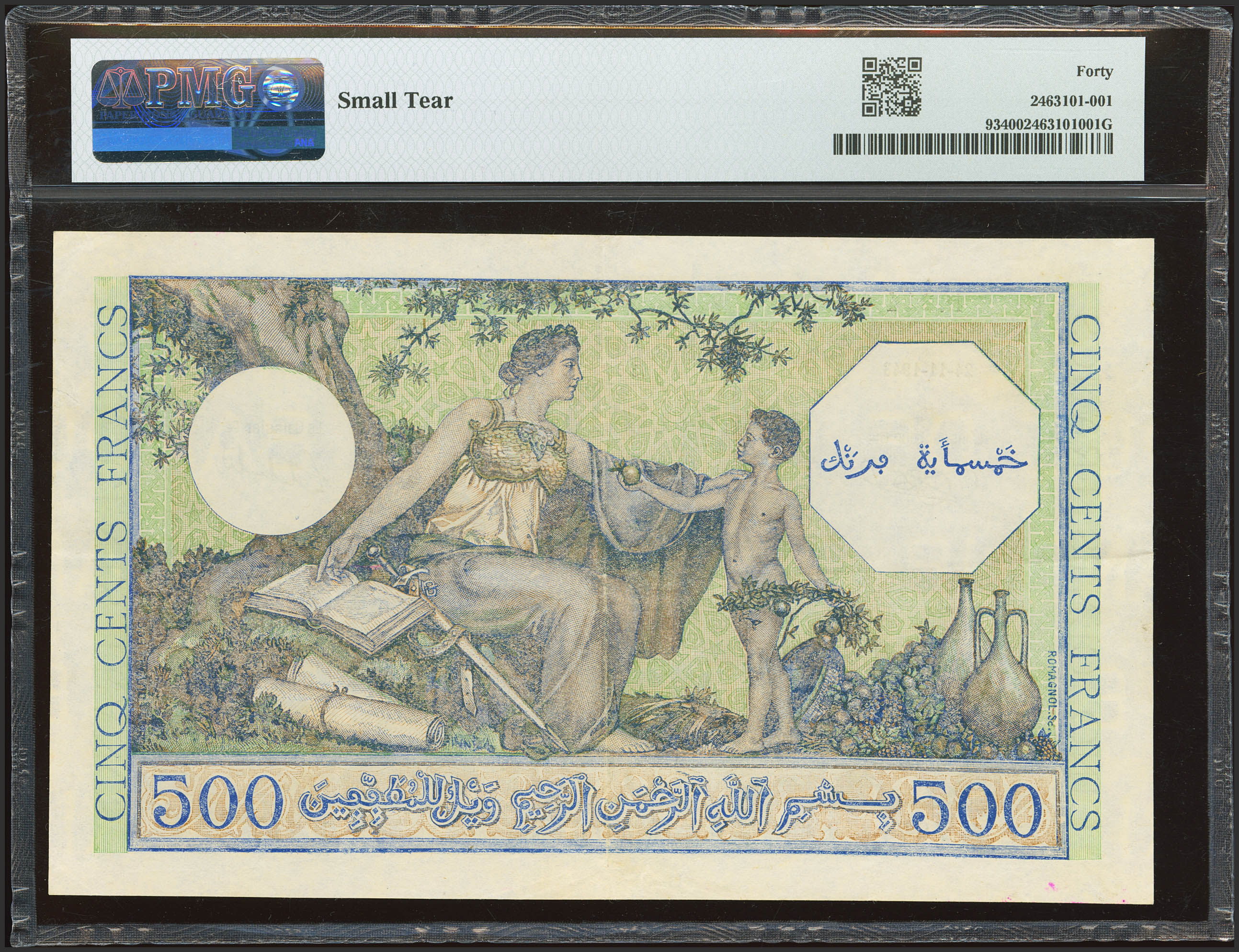ALGERIA. 500 Francs. 24 November 1943. Banque de l'Algerie. (Pick: 93). PMG40 (small tear).