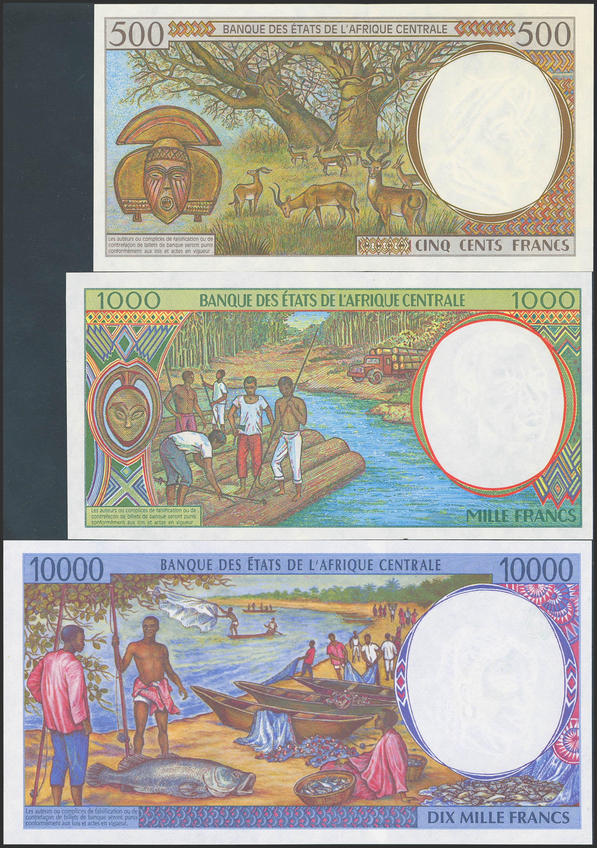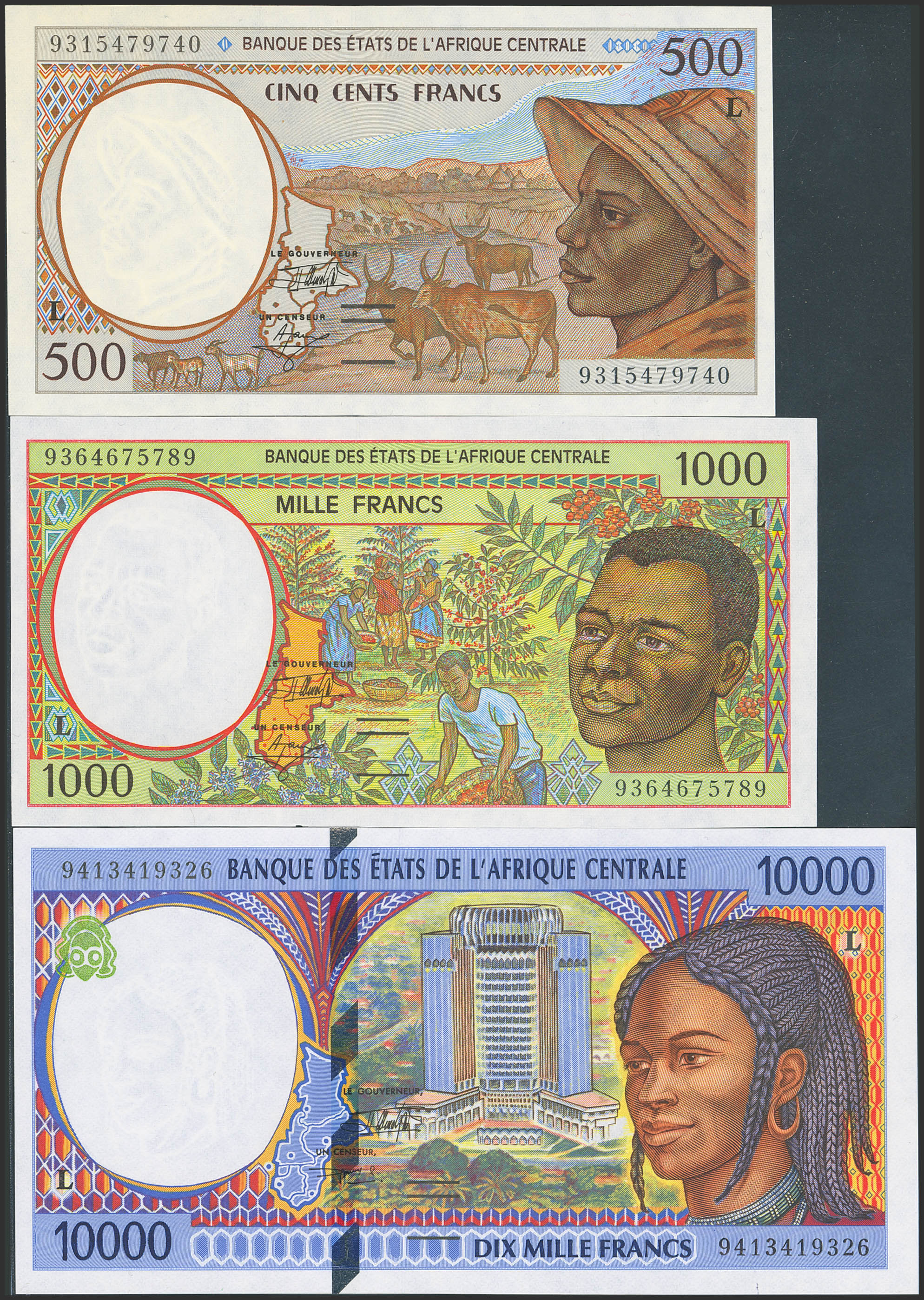 CENTRAL AFRICAN STATES. Lot of 3 notes of 500, 1000 and 10000 Francs. 1993 and 1994. Banque des Etats de l'Afrique Centrale. Gabon. (Pick: 401La, 402La, 405La). Uncirculated (2) and Less than uncirculated (1).