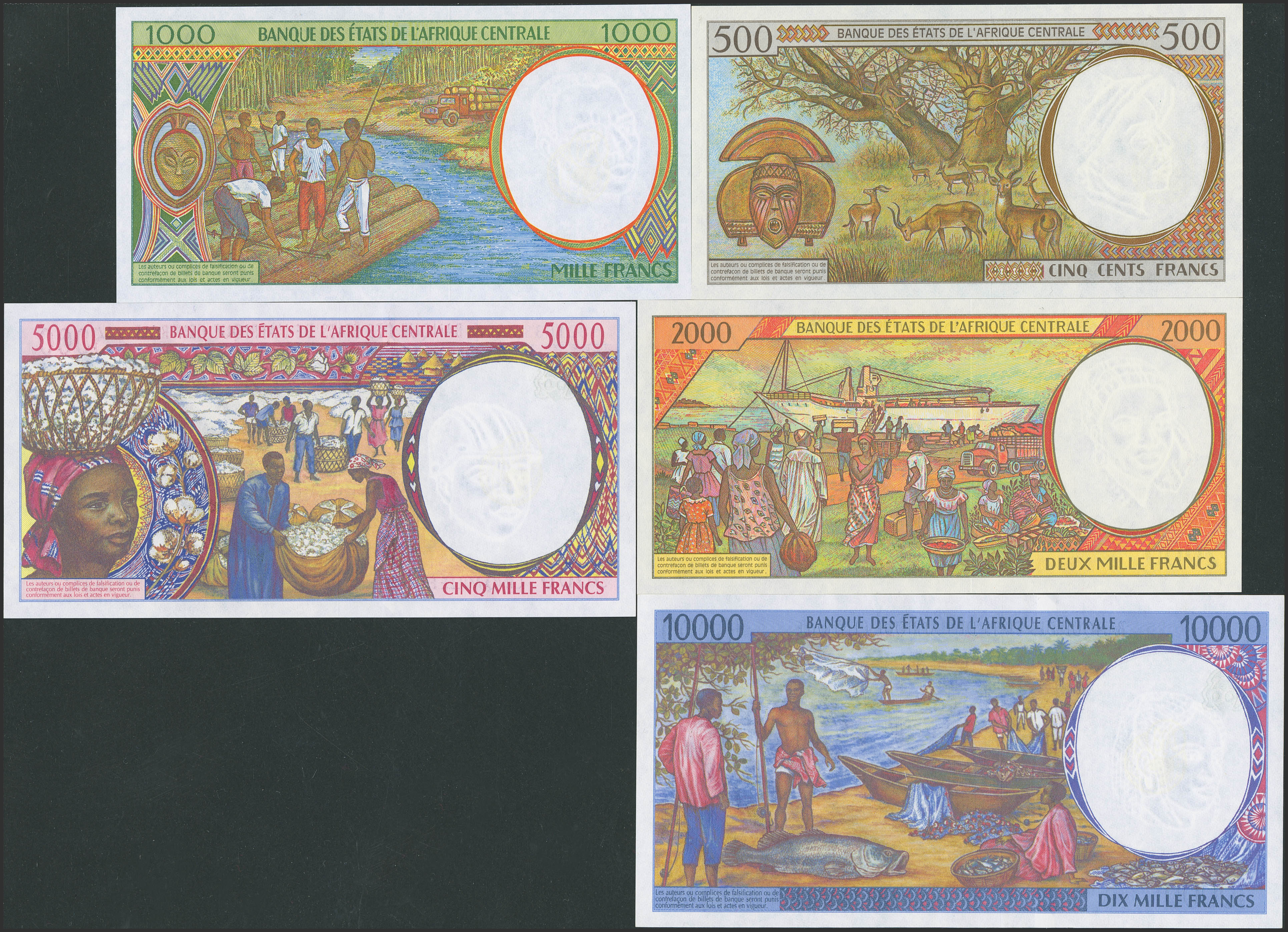 CENTRAL AFRICAN STATES. Complete set of 5 notes from 500 to 10000 Francs. 1993 to 1998. Banque des Etats de l'Afrique Centrale. Chad. (Pick: 601Pb, 602Pe, 603Pa, 604Pd, 605Pd). Uncirculated.