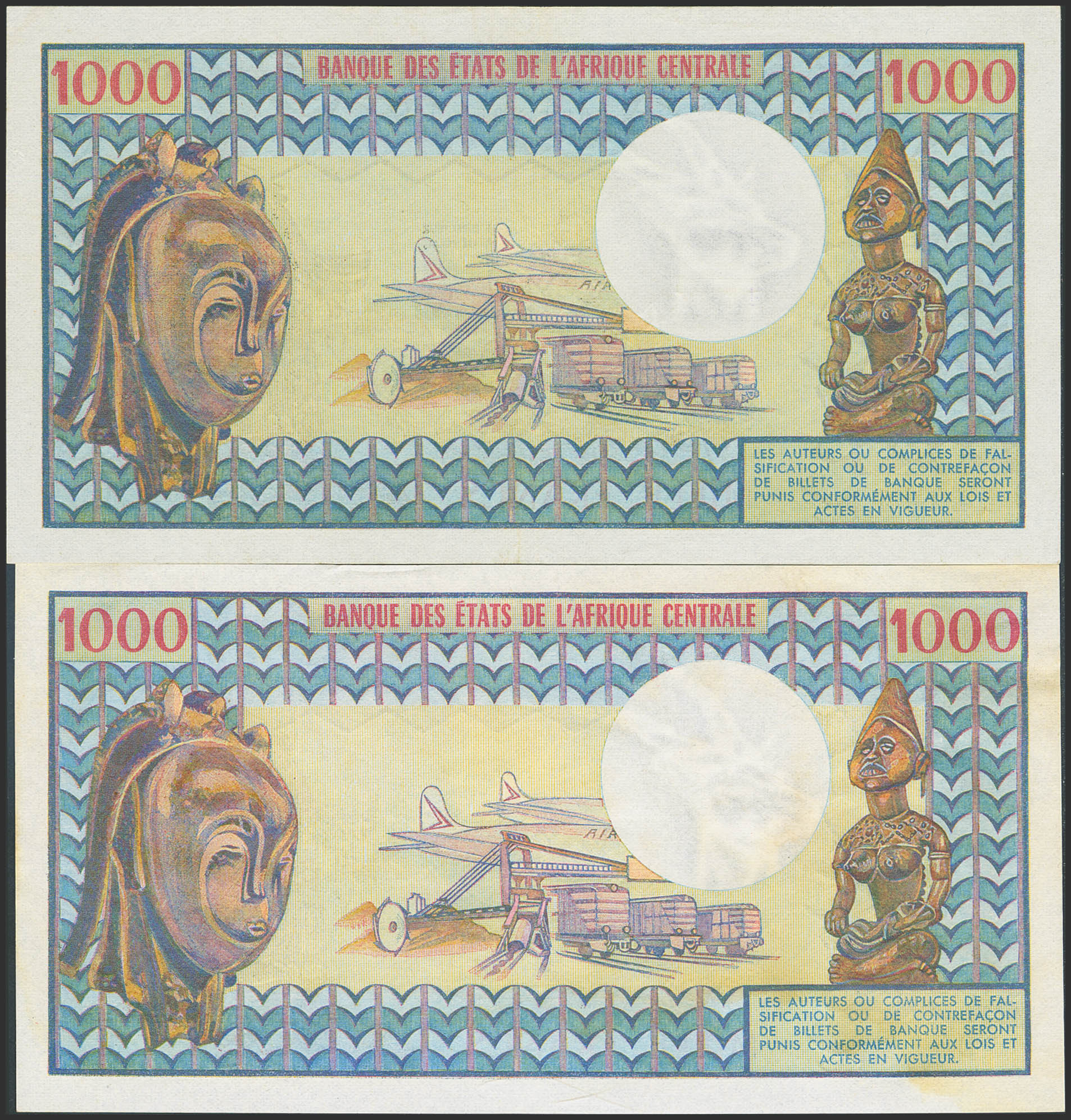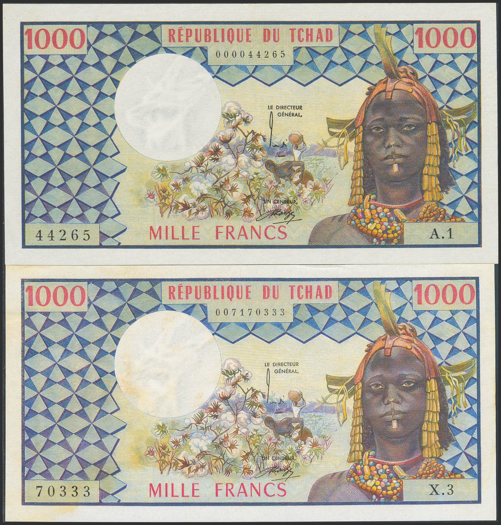 CHAD. Lot of 2 notes of 1000 Francs. (1974ca). Banque des Etats de l'Afrique Centrale. (Pick: 3a). Extremely Fine and Less than Uncirculated.