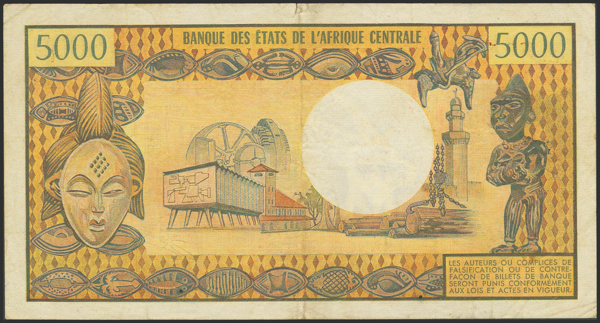 CHAD. 5000 Francs. (1974ca). Banque des Etats de l'Afrique Centrale. (Pick: 4). Flattened, tears, pinholes. Very Fine.