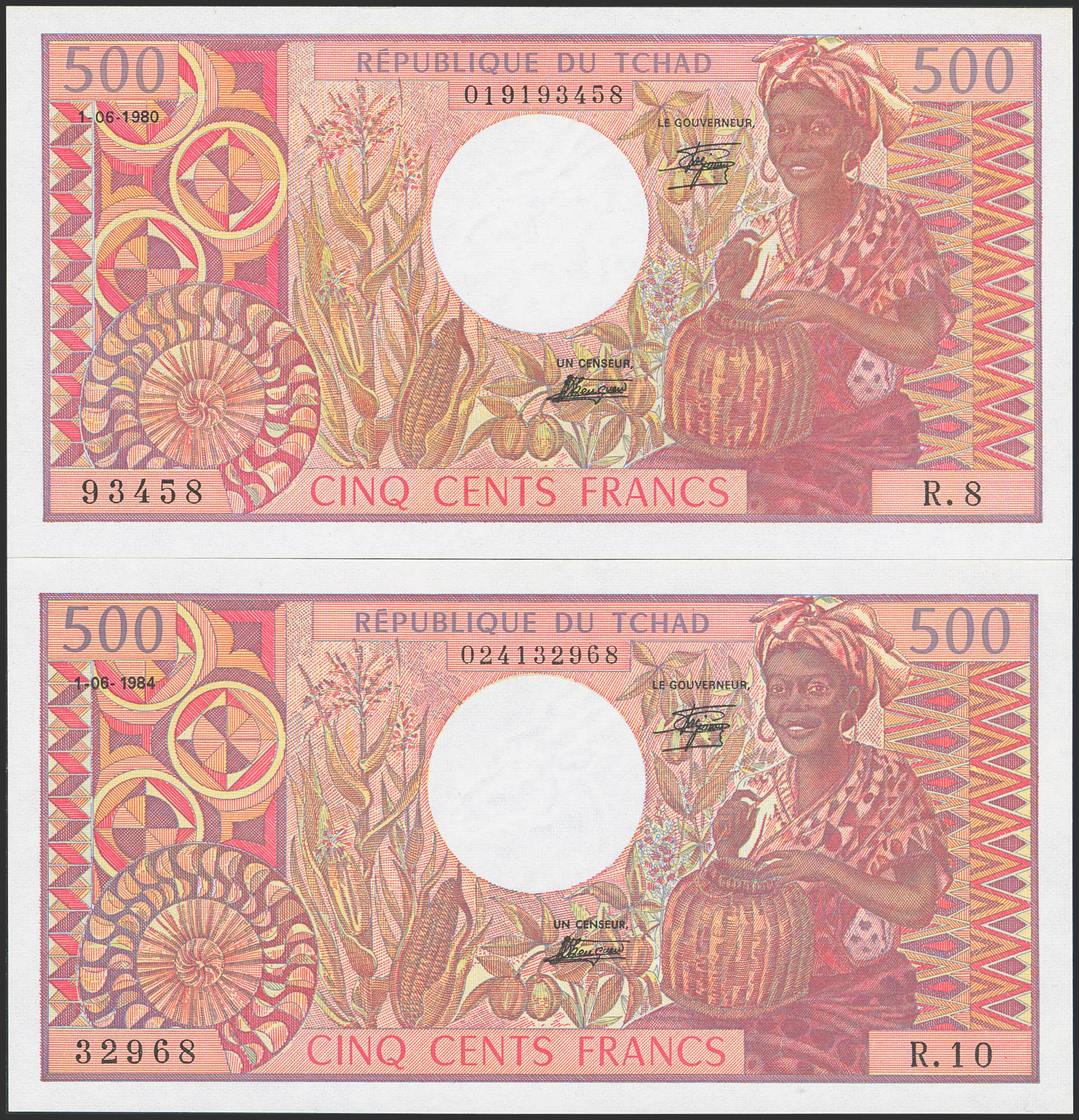 CHAD. Lot of 2 notes of 500 Francs. 1 June 1980 and 1 June 1984. Banque des Etats de l'Afrique Centrale. (Pick: 6). Uncirculated.