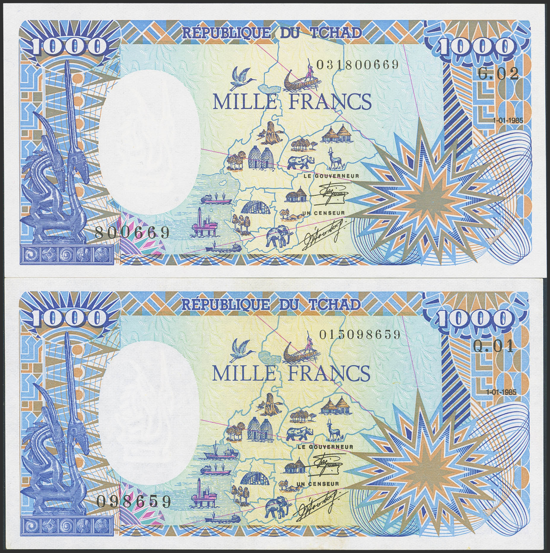 CHAD. Lot of 2 notes of 1000 Francs. 1 January 1985. Banque des Etats de l'Afrique Centrale. Republique du Tchad. (Pick: 10, 10Aa). Almost Uncirculated and Less than Uncirculated.