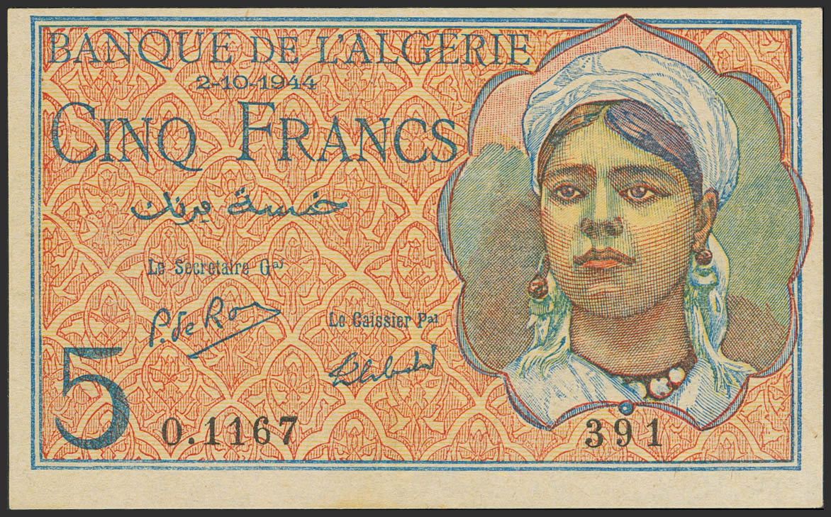 ALGERIA. 5 Francs. 2 October 1944. Banque de l’Algerie. (Pick: 94b). More than Extremely Fine.