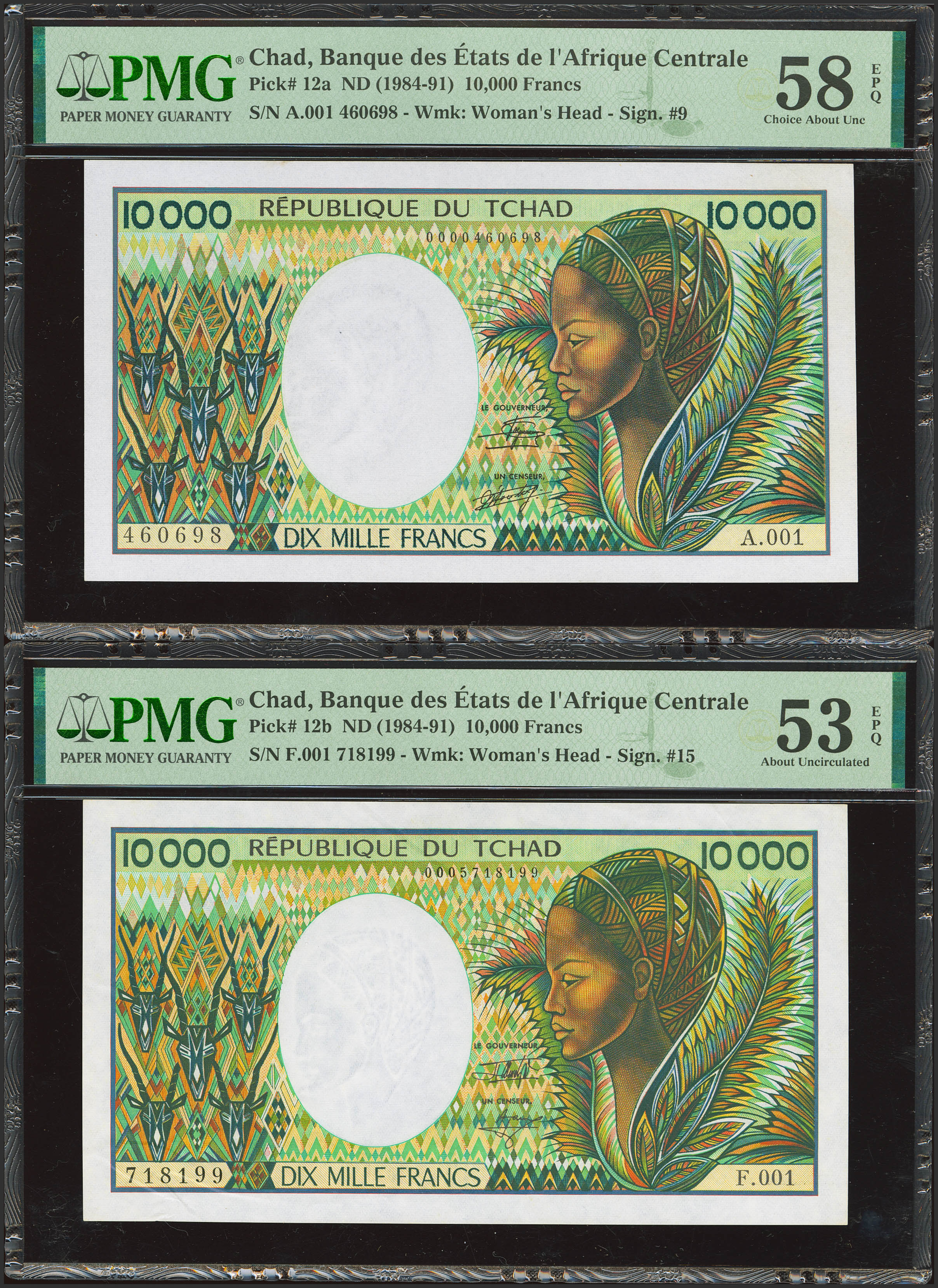 CHAD. Lot of 2 notes of 10000 Francs. (1984ca). Banque des Etats de l'Afrique Centrale. Republique du Tchad. (Pick: 12a, 12b). PMG53EPQ/58EPQ.