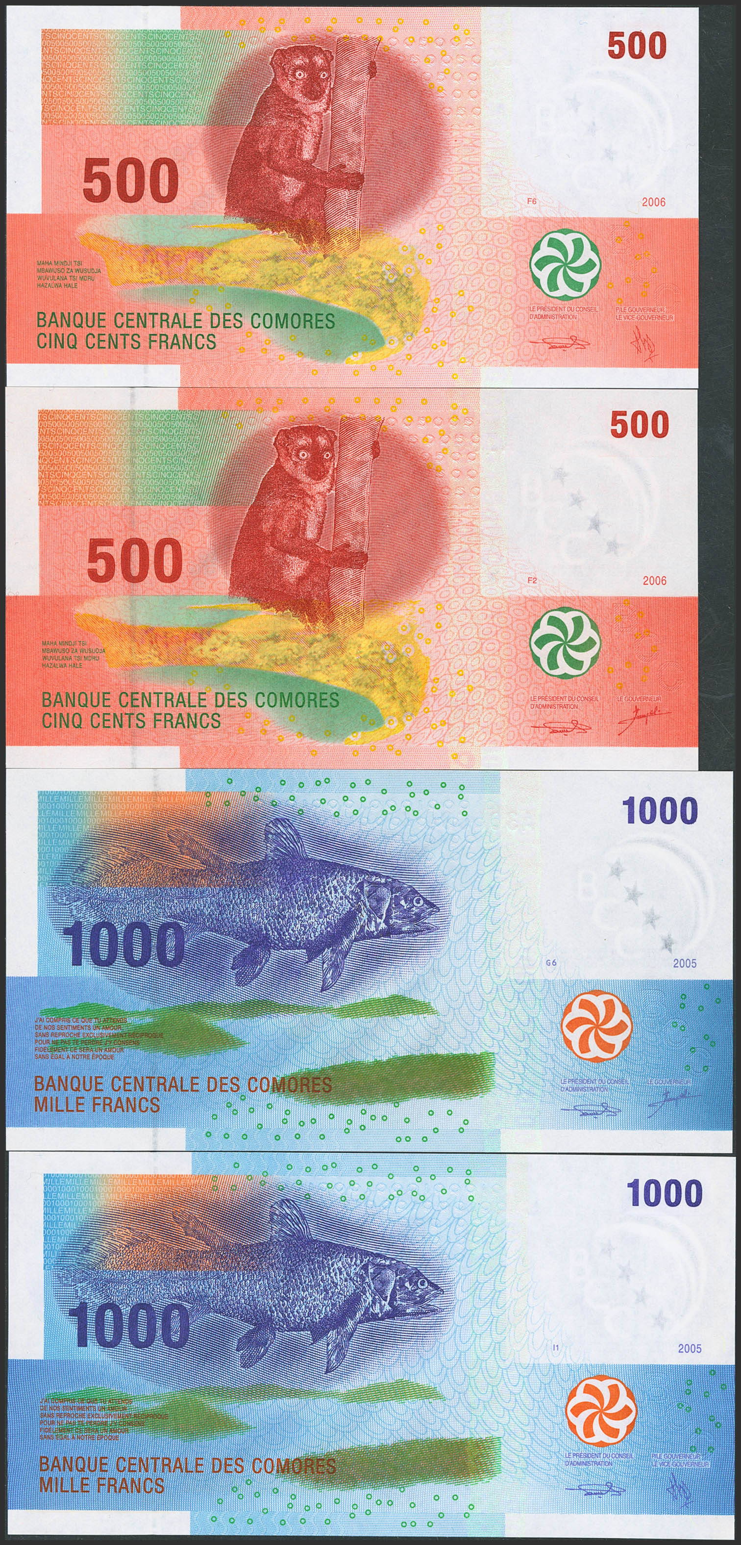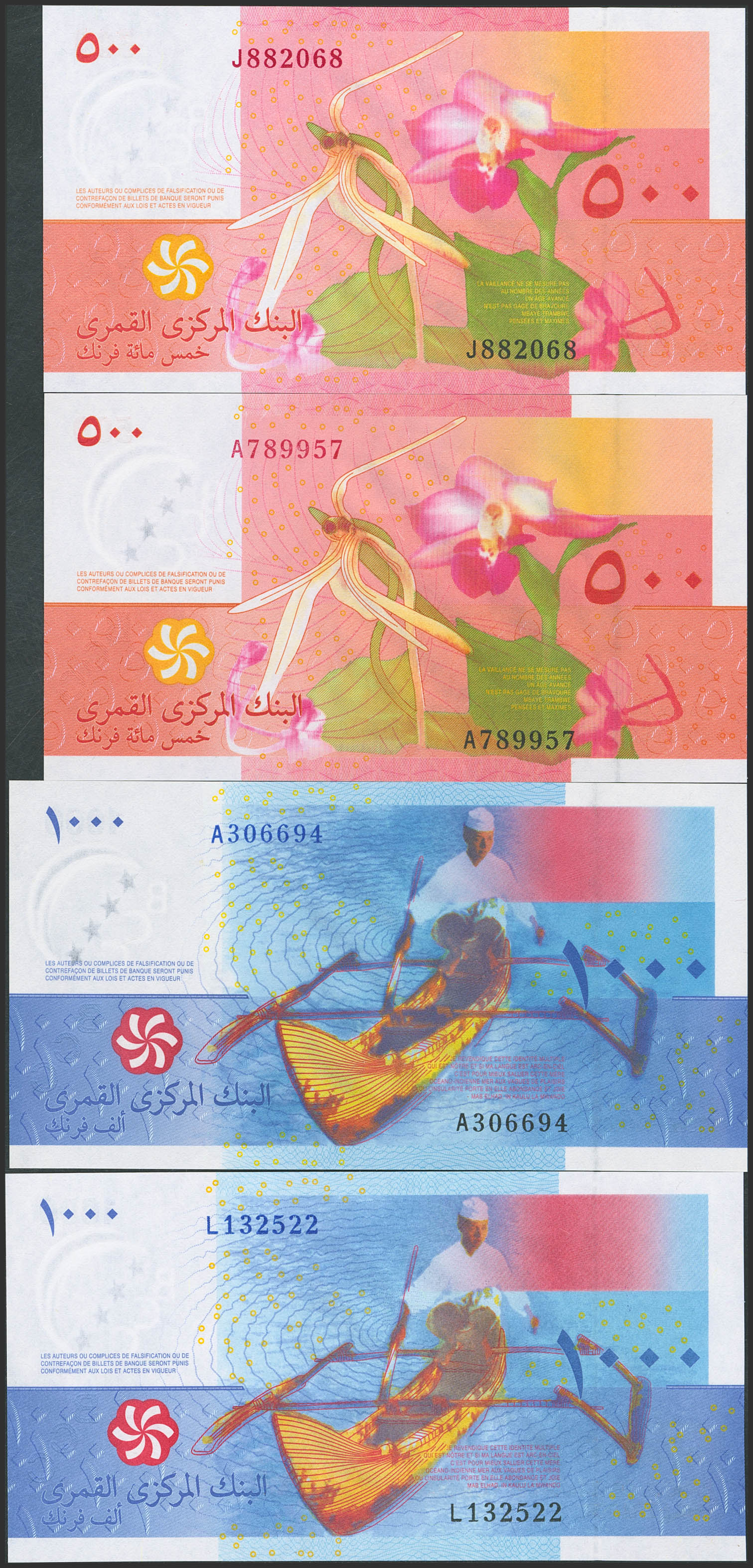 COMOROS. Lot of 4 notes of 500 and 1000 Francs. (2005ca). Banque Centrale. (Pick: 15a, 15b, 16a, 16b). Uncirculated.