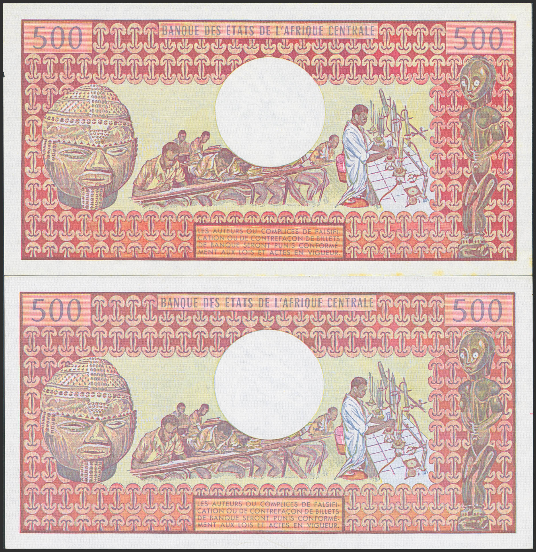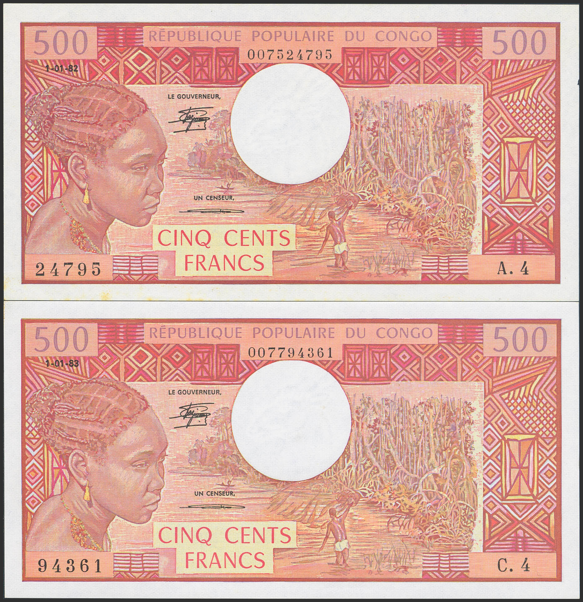 CONGO. Lot of 2 notes of 500 Francs. 1982 and 1983. Banque Centrale des Etats del'Afrique Centrale. (Pick: 2d). Light yellow stains on the margin of one of them. Less than Uncirculated.