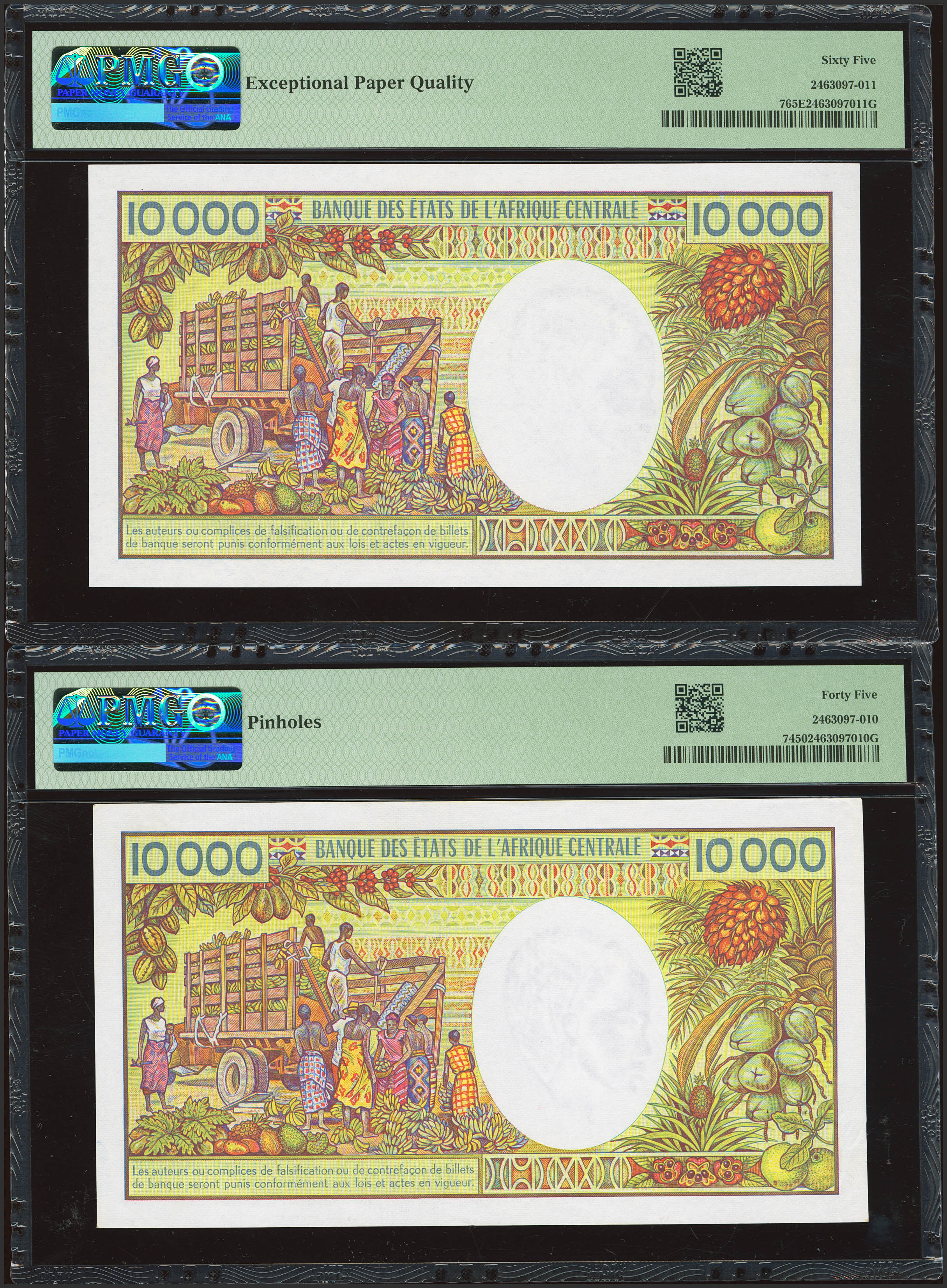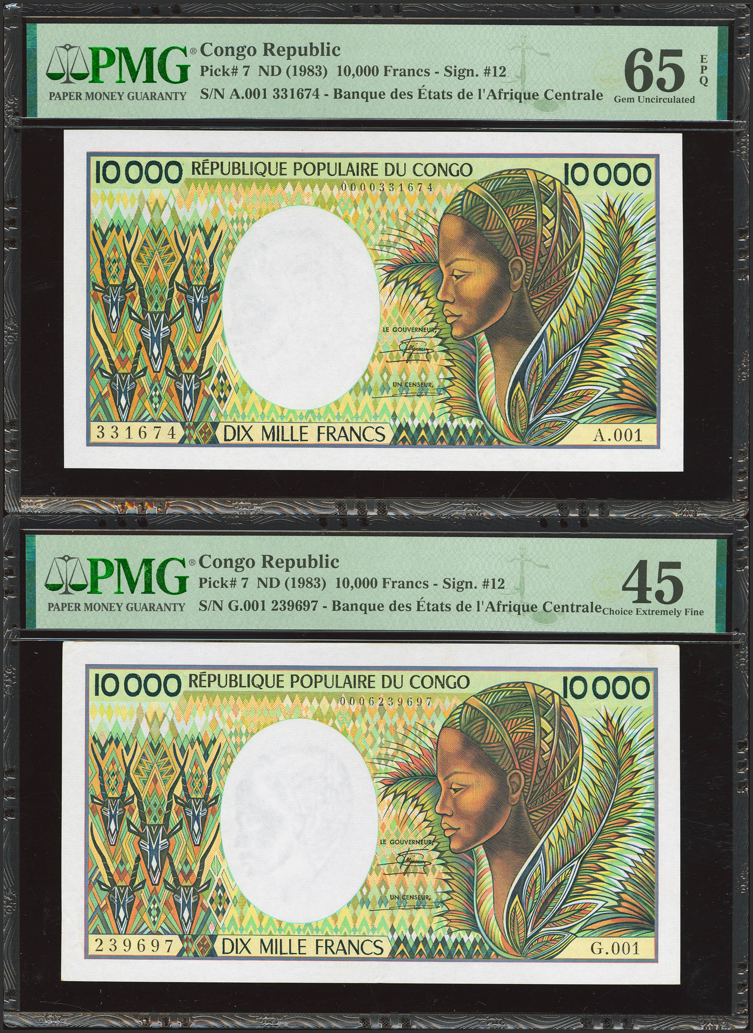 CONGO. Lot of 2 notes of 10000 Francs. (1983ca). Banque Centrale des Etats del'Afrique Centrale. Republique Populaire du Congo. (Pick: 7).PMG65EPQ/45(pinholes).
