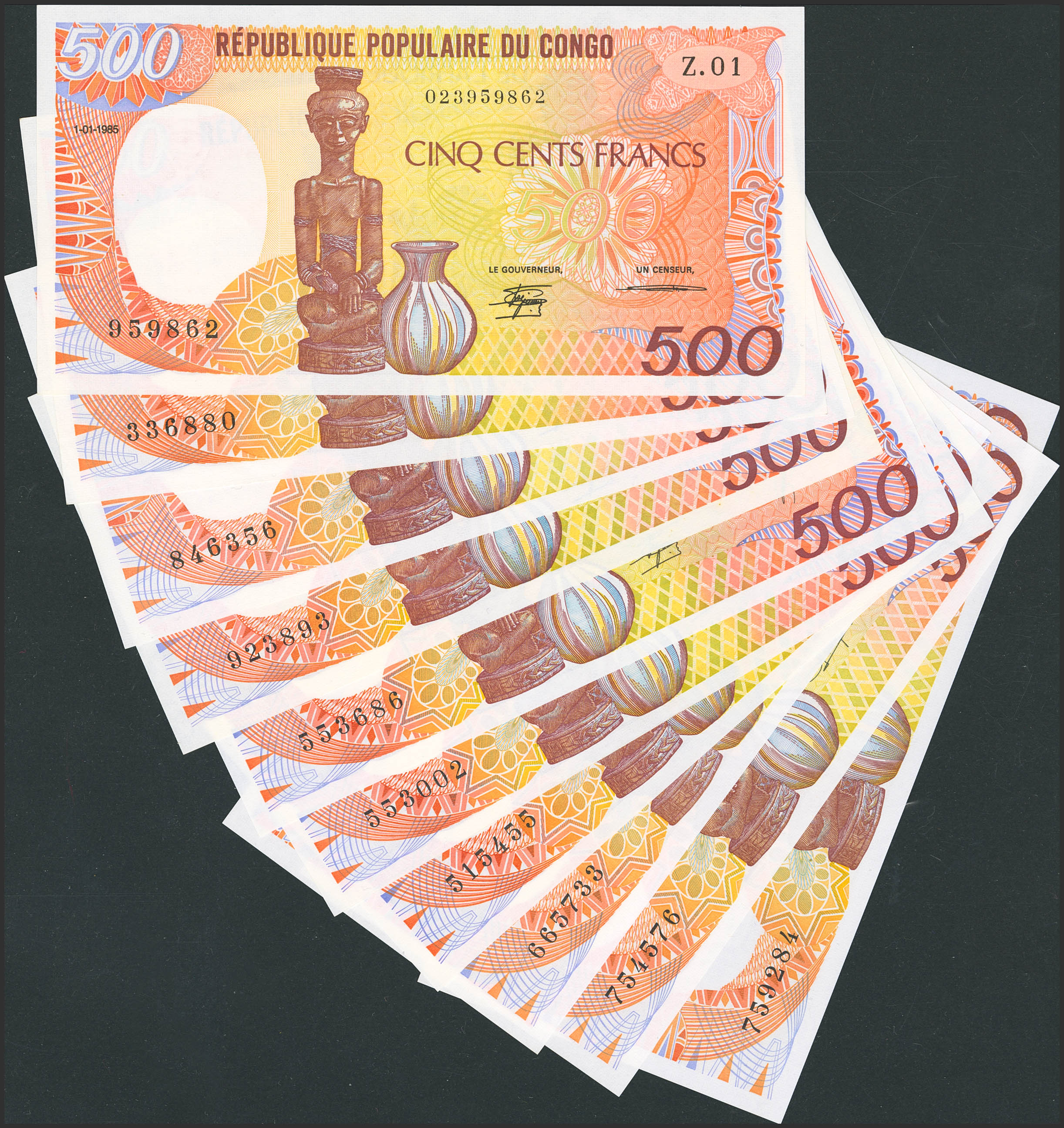 CONGO. Lot of 10 notes of 500 Francs. January 1 from 1985 to 1991. Banque Centrale des Etats del'Afrique Centrale. Republique Populaire du Congo. (Pick: 8a(4), 8c(3), 8d(3)). Uncirculated (9) and Less than Uncirculated (1).