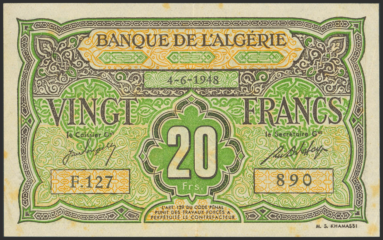 ALGERIA. 20 Francs. 4 June 1948. Banque de l’Algerie. (Pick: 103). Stains. Extremely Fine.
