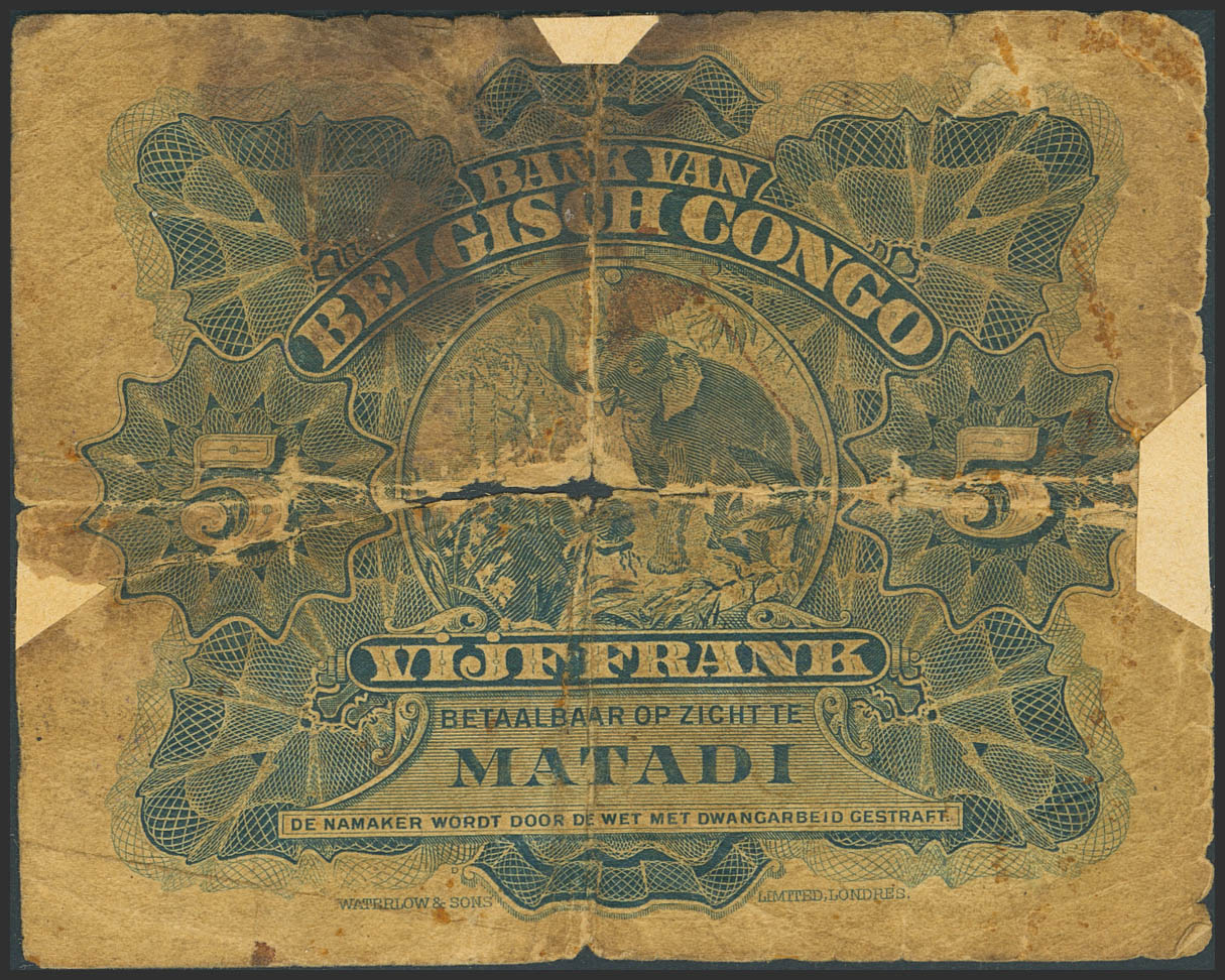 BELGIAN CONGO. 5 Francs. 15 October 1914. Banque du Congo Belge. Matadi. (Pick: 4B). Splits and tears, and paper added in areas where paper is missing. Good.