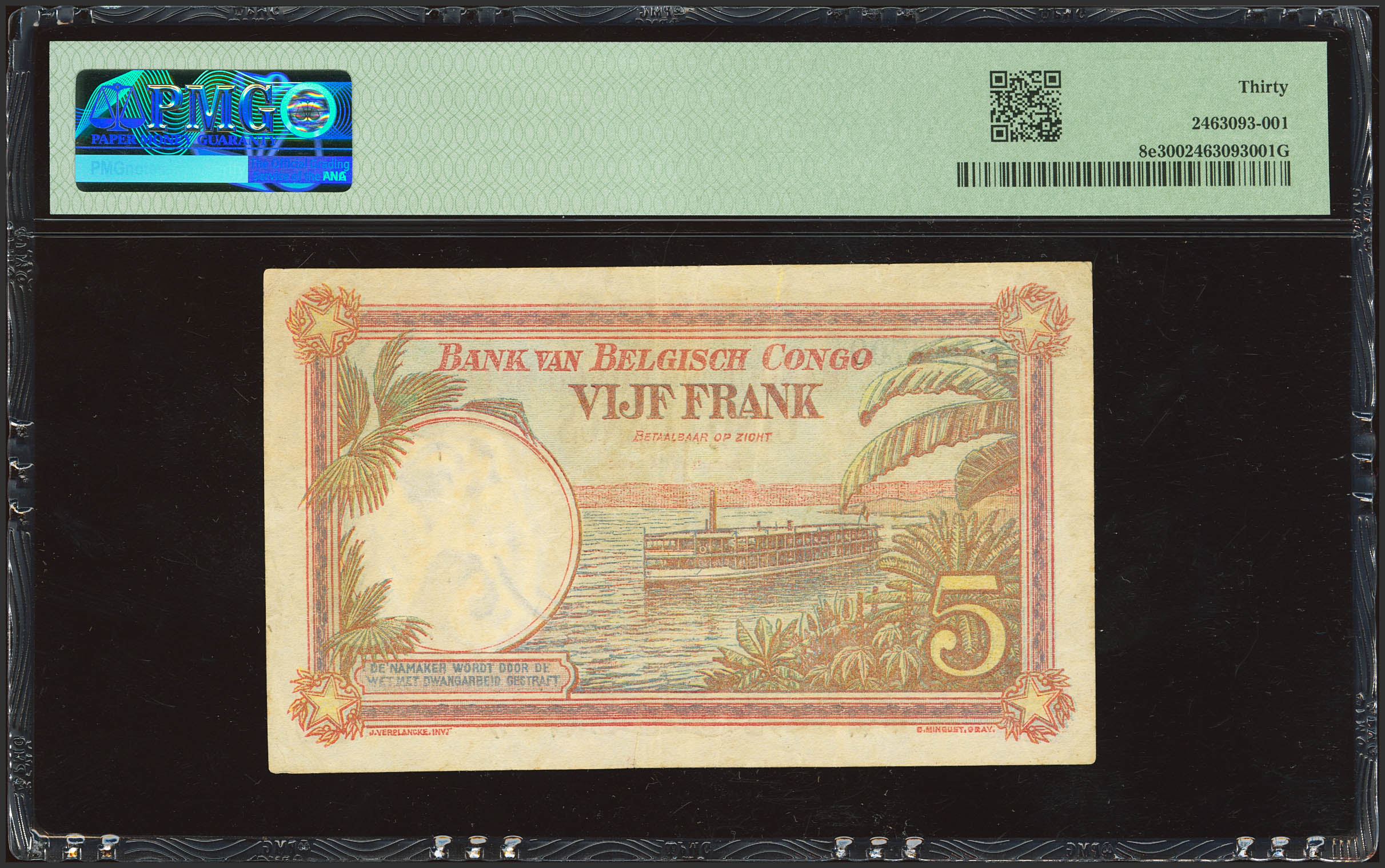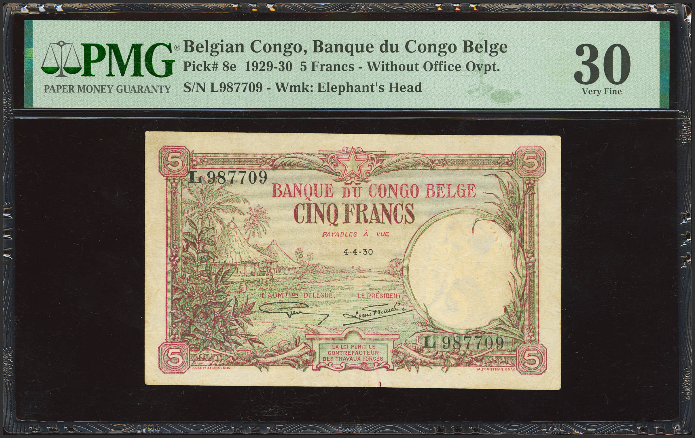 BELGIAN CONGO. 5 Francs. 4 April 1930. Banque du Congo Belge. Without place of issue. (Pick: 8e). PMG30.