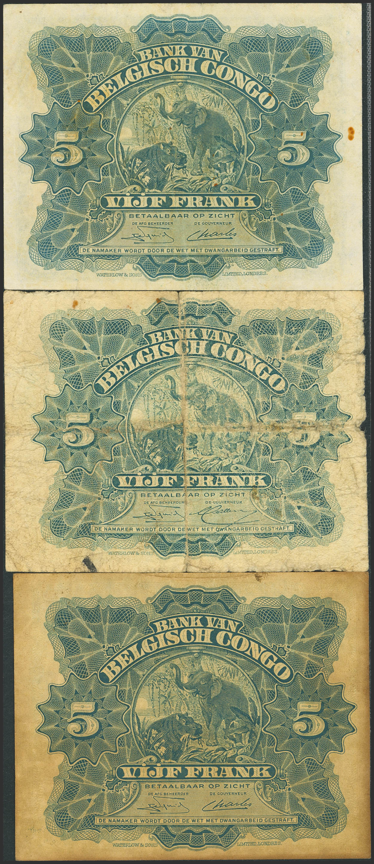 BELGIAN CONGO. Lot of 3 notes of 5 Francs. 1949 to 1952. Banque du Congo Belge. (Pick: 13B). Fine, Very Fine and Extremely Fine.