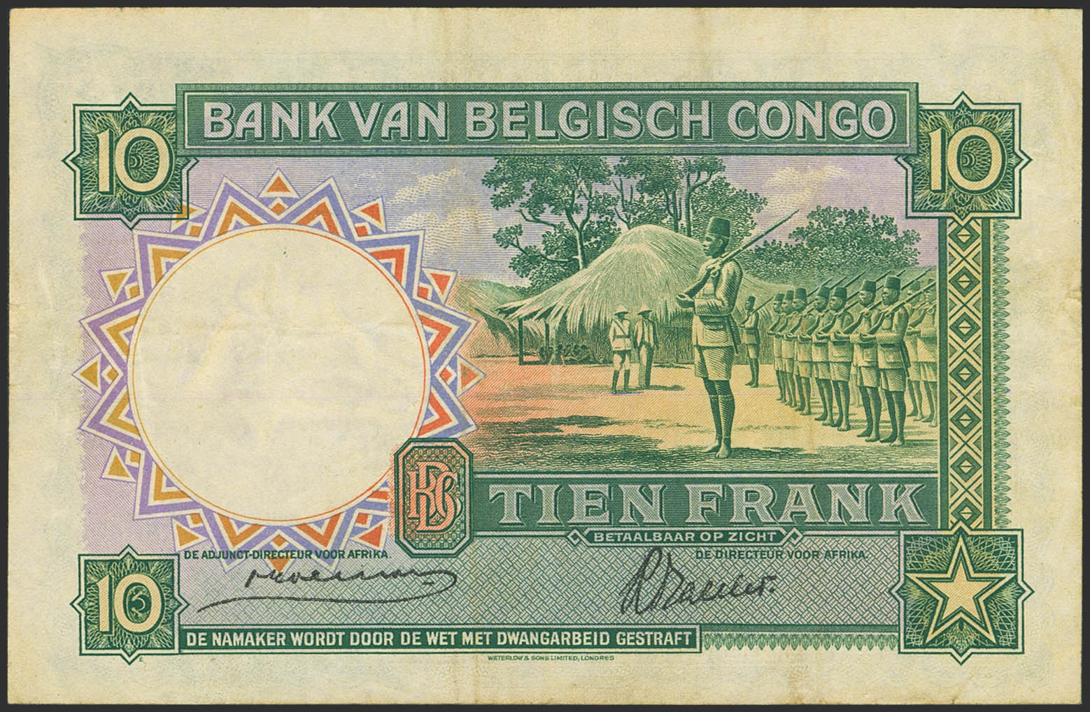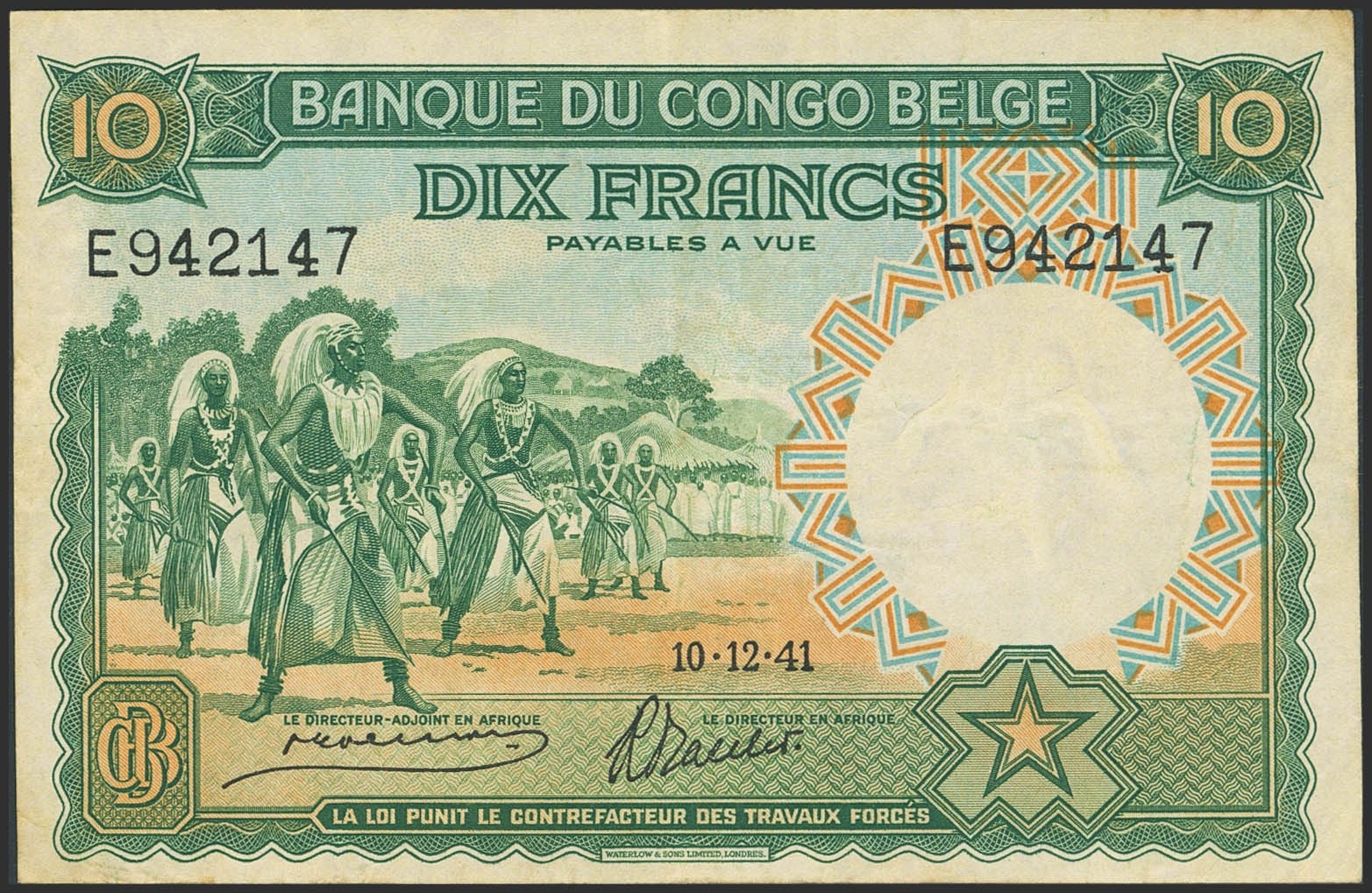 BELGIAN CONGO. 10 Francs. 10 December 1941. Banque du Congo Belge. (Pick: 14). More than Very Fine.