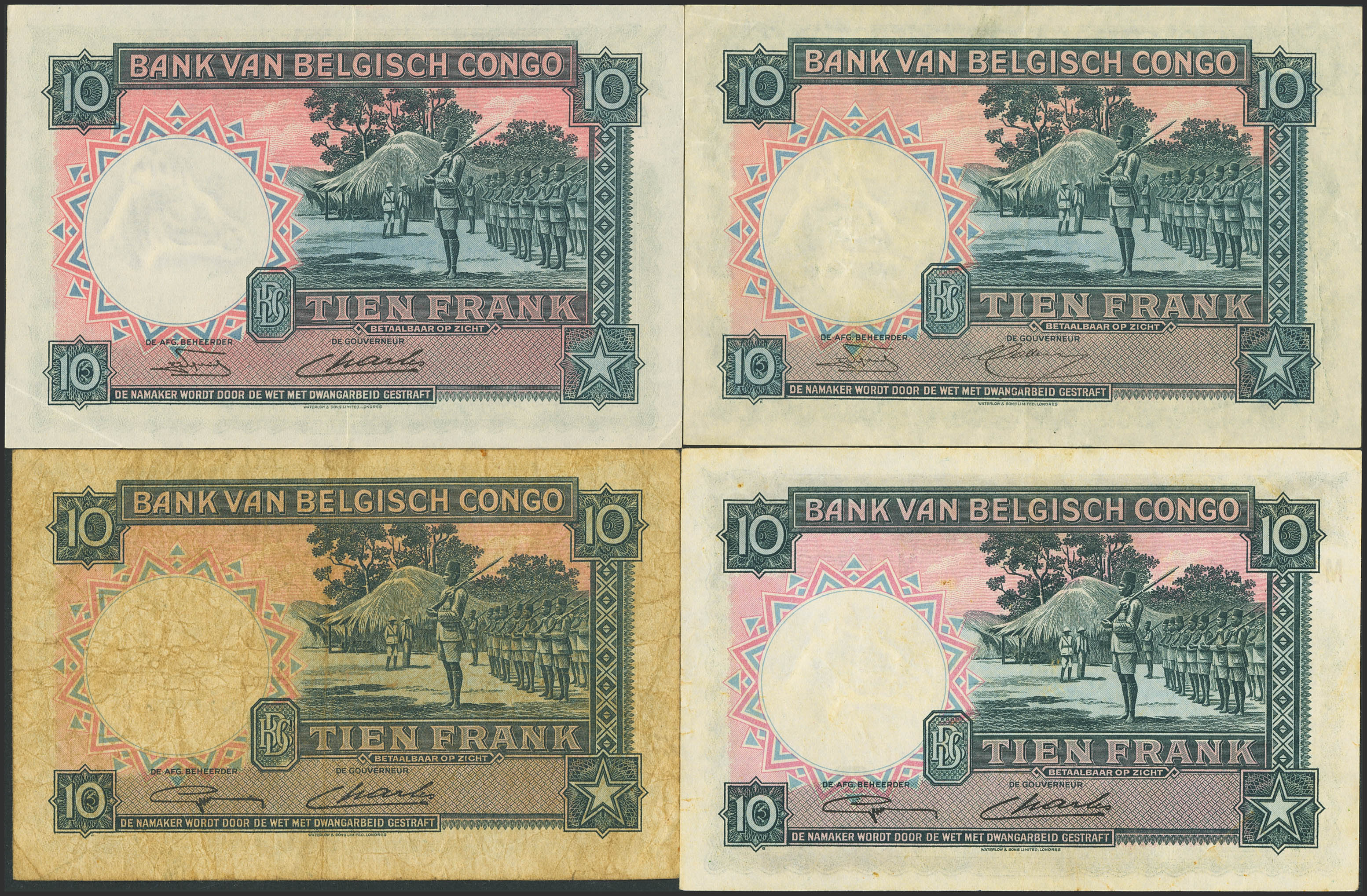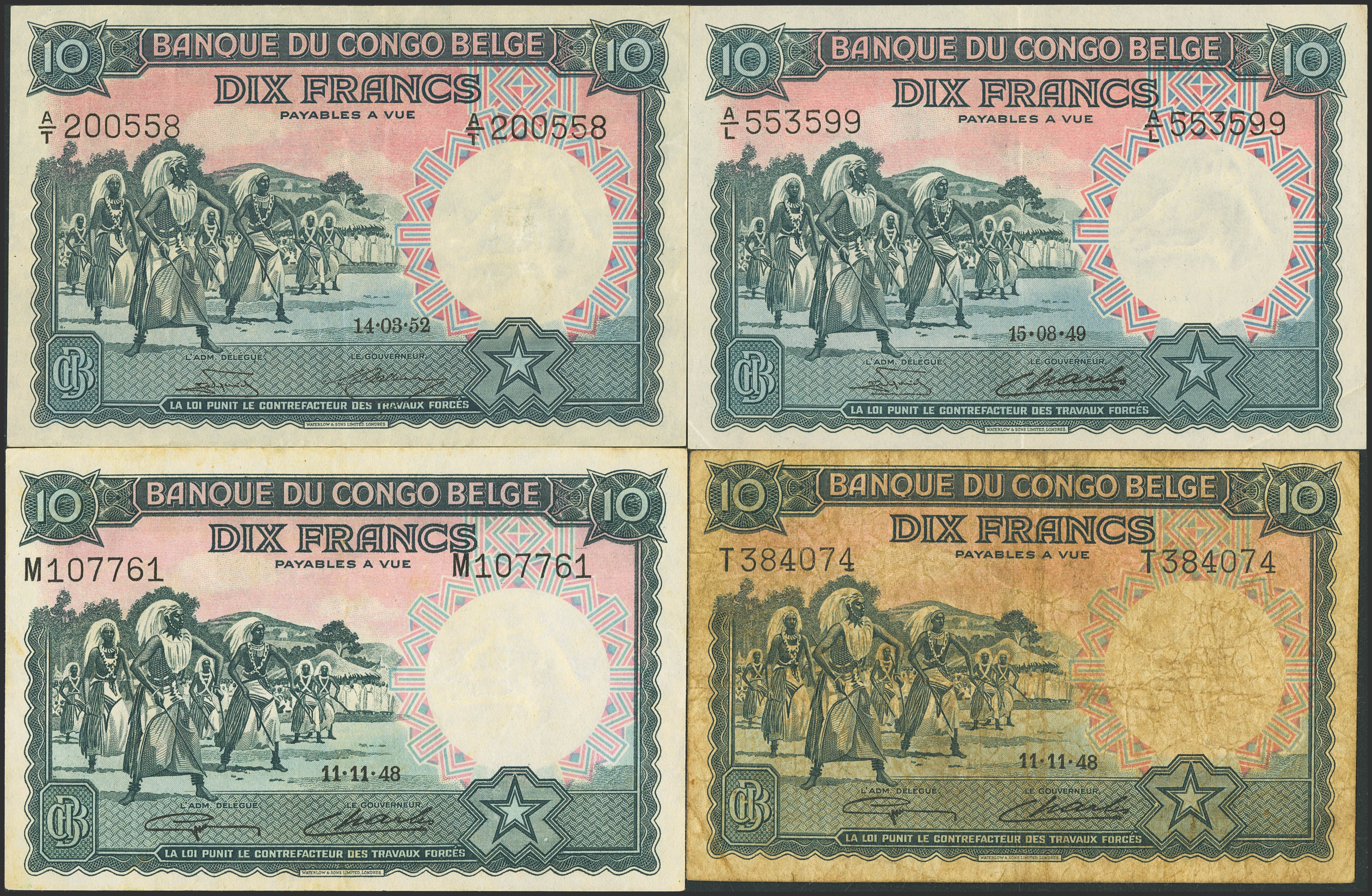 BELGIAN CONGO. Lot of 4 notes of 10 Francs. 1948 to 1952. Banque du Congo Belge. (Pick: 14E). Fine to Almost Uncirculated.