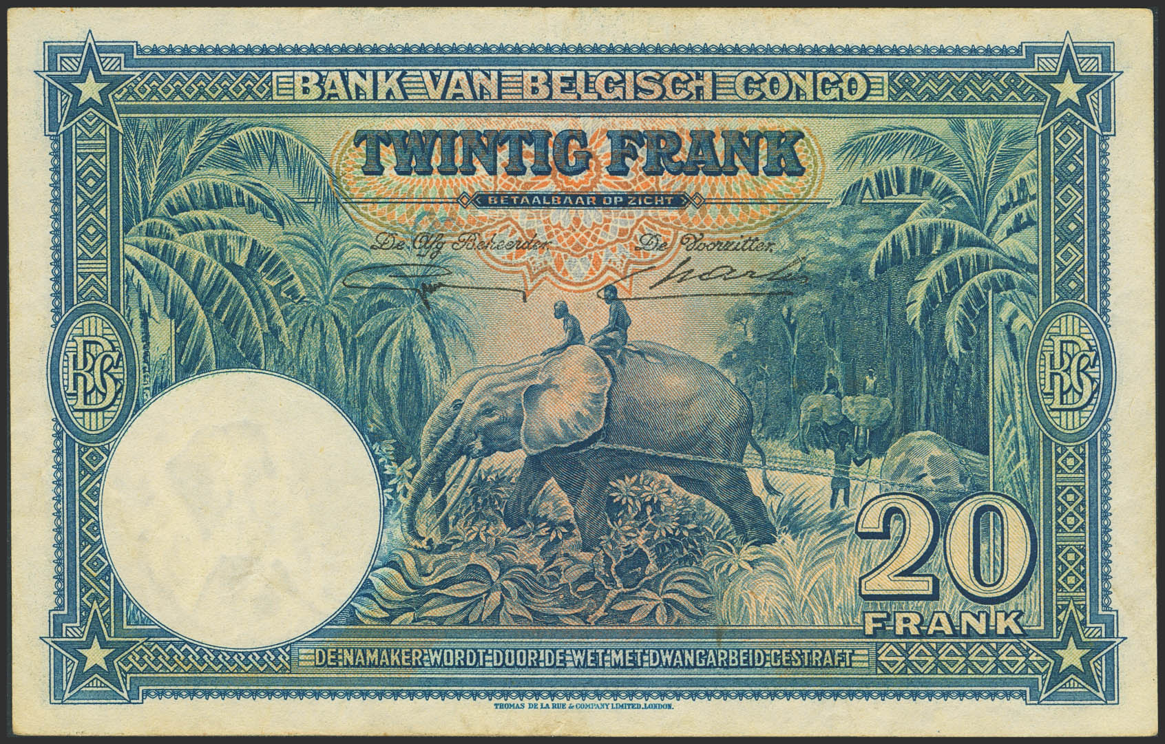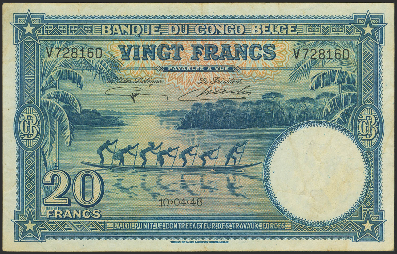 BELGIAN CONGO. 20 Francs. 10 April 1946. Banque du Congo Belge. (Pick: 15E). More than Very Fine.
