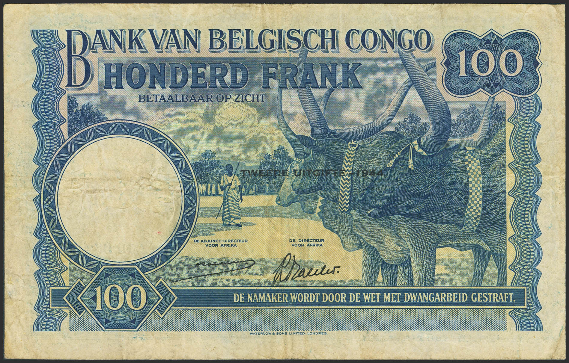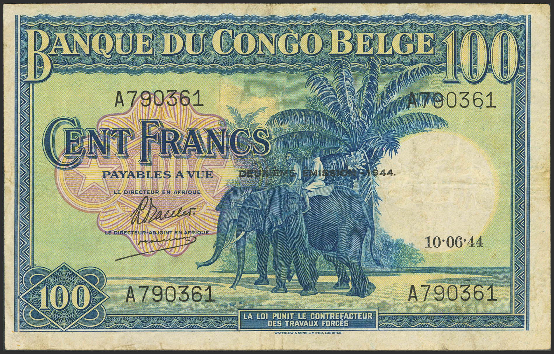 BELGIAN CONGO. 100 Francs. 10 June 1944. Banque du Congo Belge. (Pick: 17b). Very Fine.