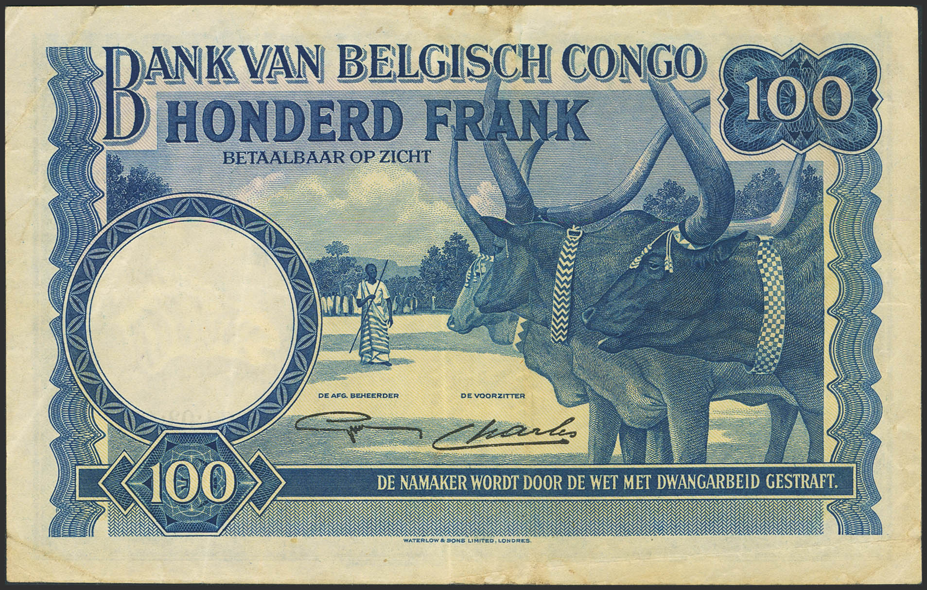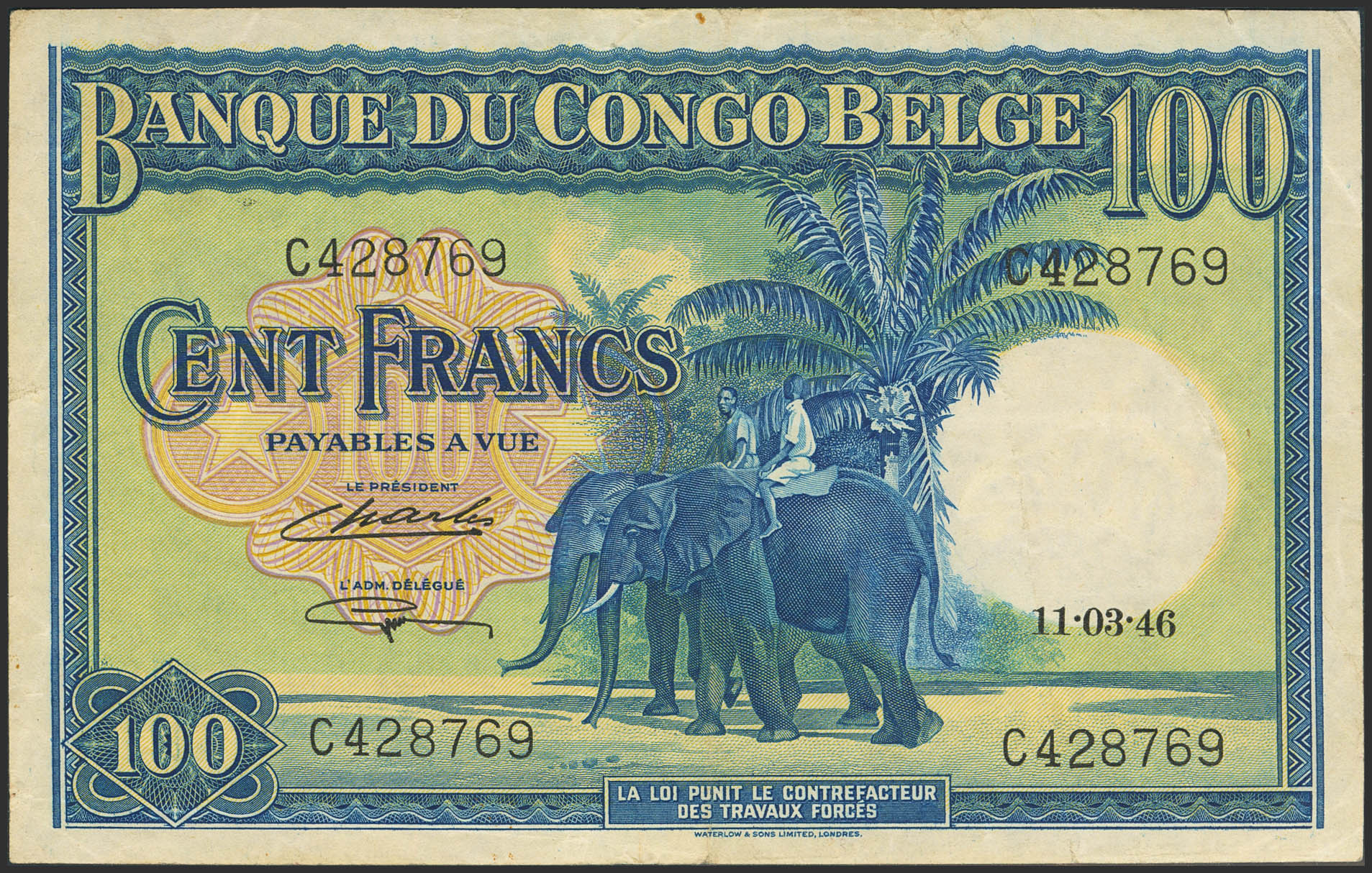 BELGIAN CONGO. 100 Francs. 11 March 1946. Banque du Congo Belge. (Pick: 17c). More than Very Fine.