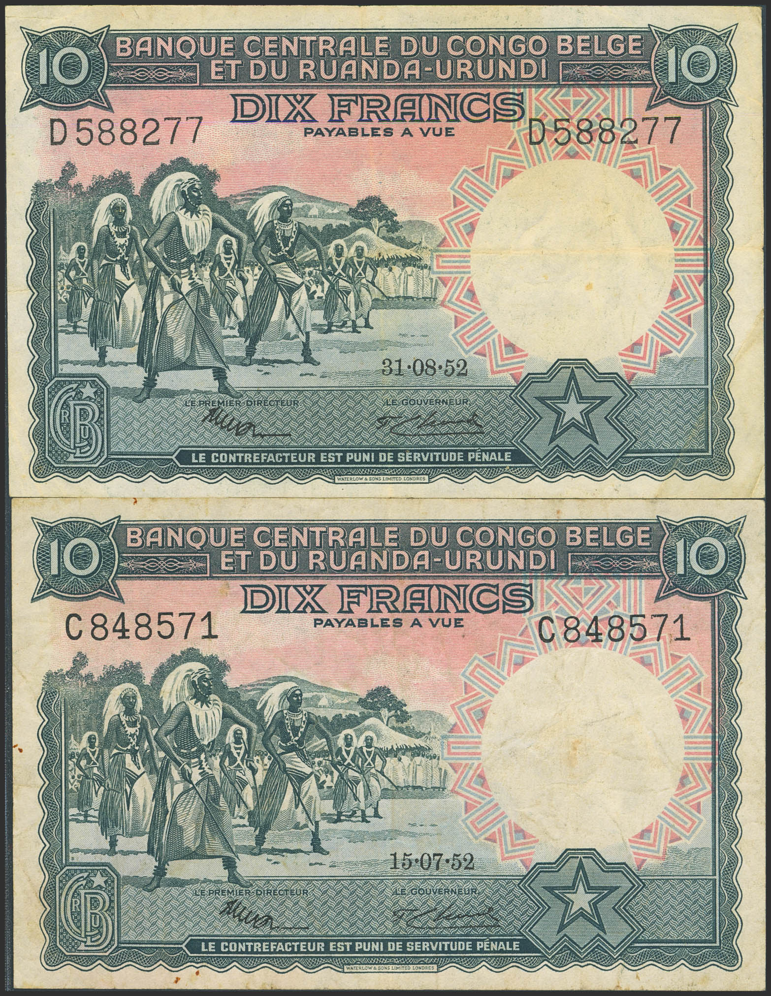 BELGIAN CONGO. Lot of 2 notes of 10 Francs. 15 July and 31 August 1952. Banque Centrale du Congo Belge et du Ruanda-Urundi. (Pick: 22). Very Fine and More than Very Fine.