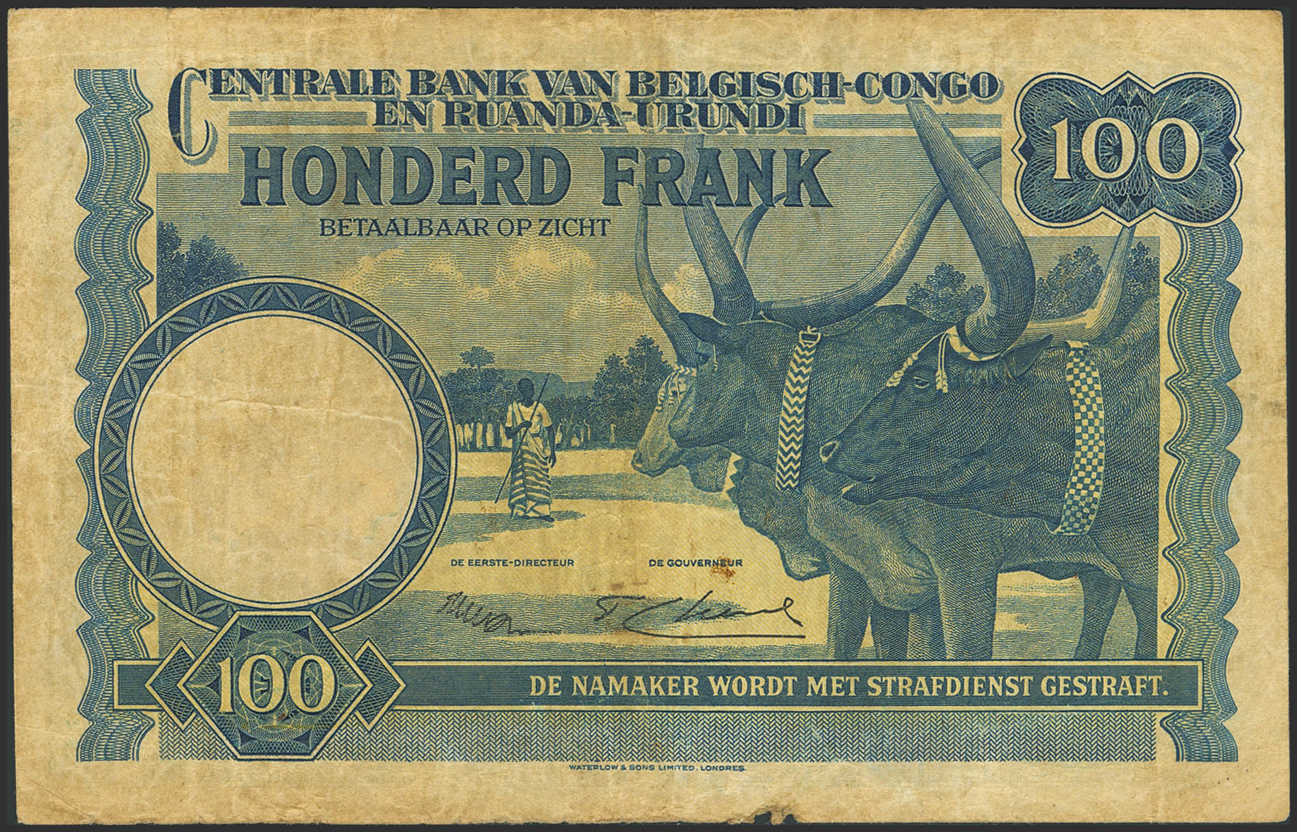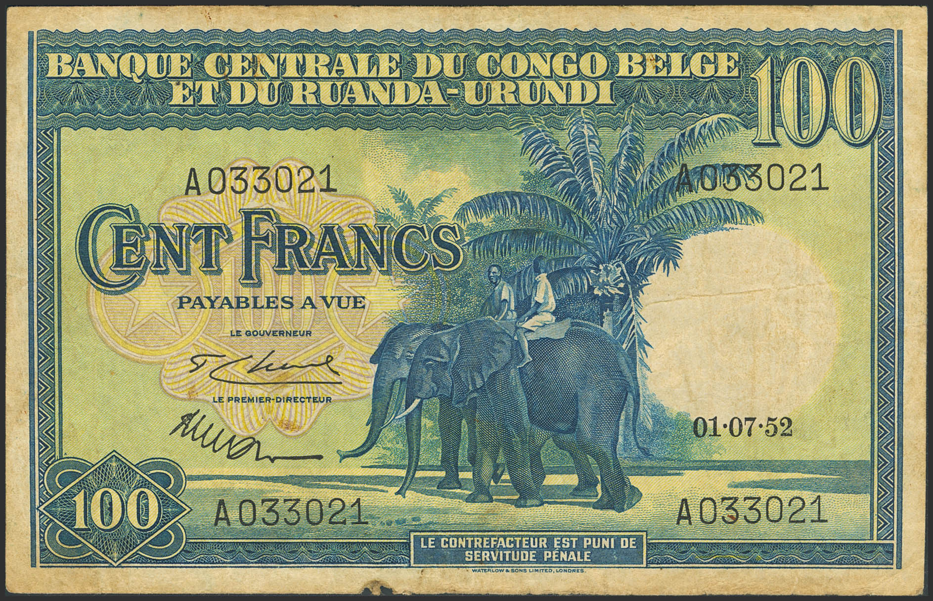 BELGIAN CONGO. 100 Francs. 1 July 1952. Banque Centrale du Congo Belge et du Ruanda-Urundi. (Pick: 25a). Nick on lower edge. More than Fine.
