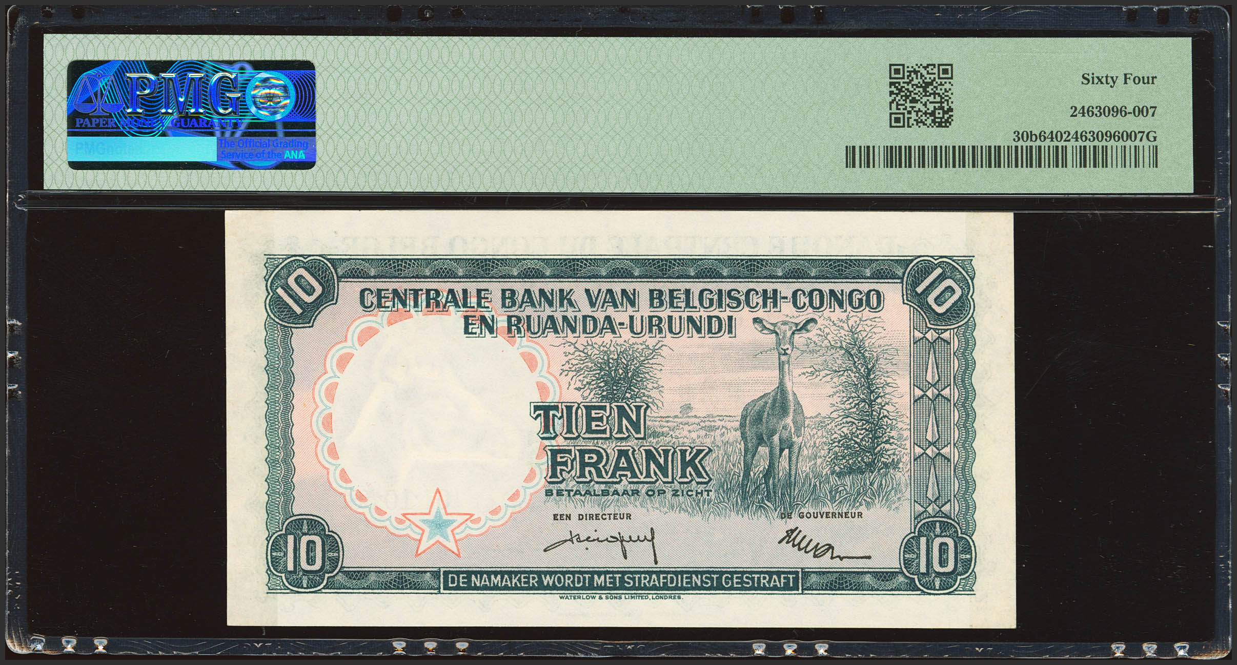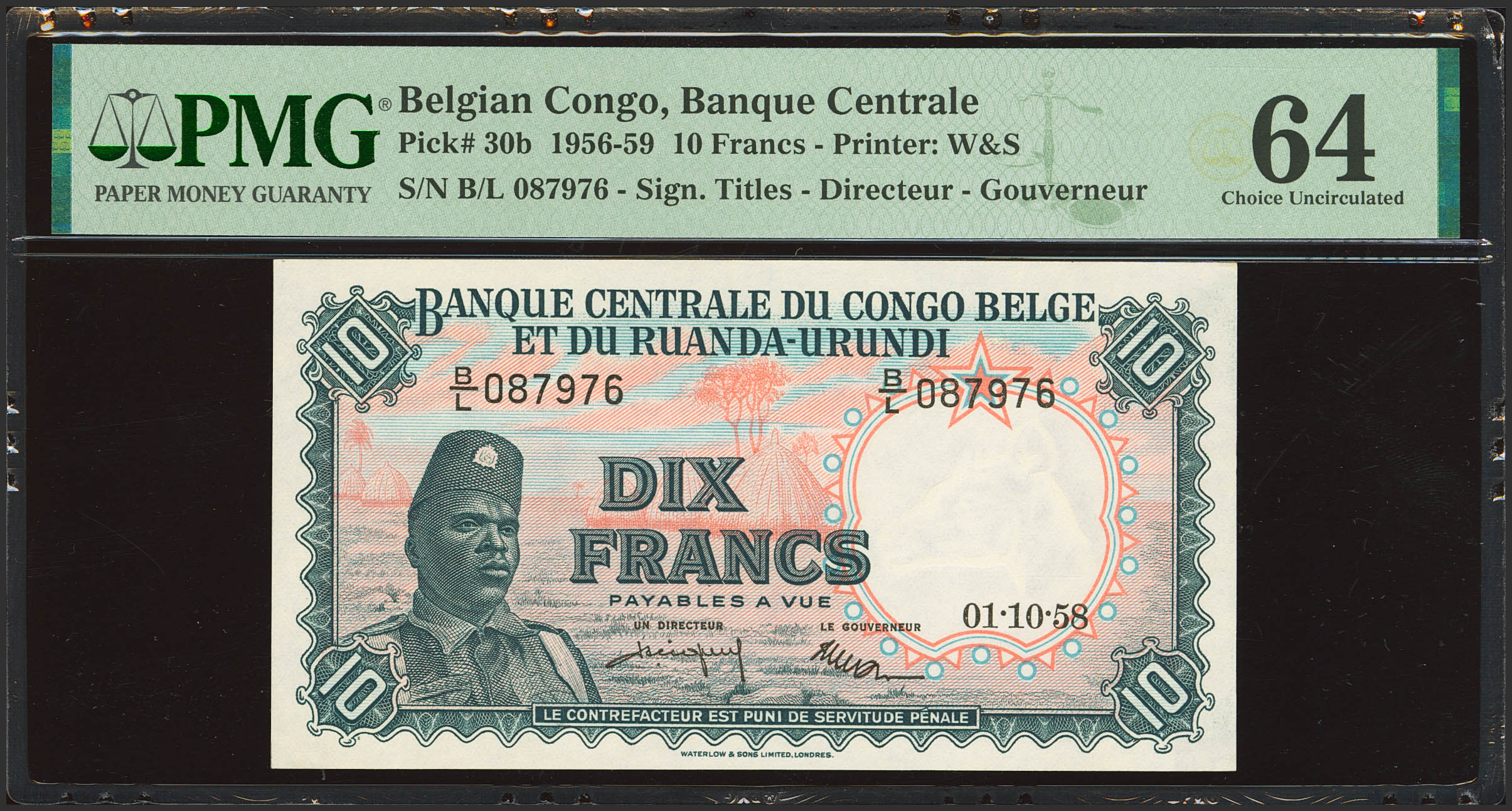 BELGIAN CONGO. 10 Francs. 1 October 1958. Banque Centrale du Congo Belge et du Ruanda-Urundi. (Pick: 30b). PMG64.