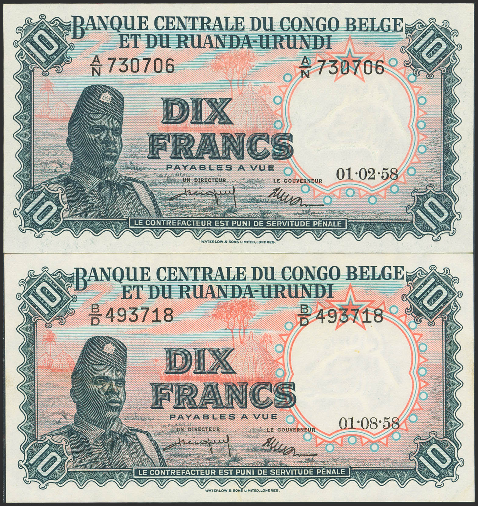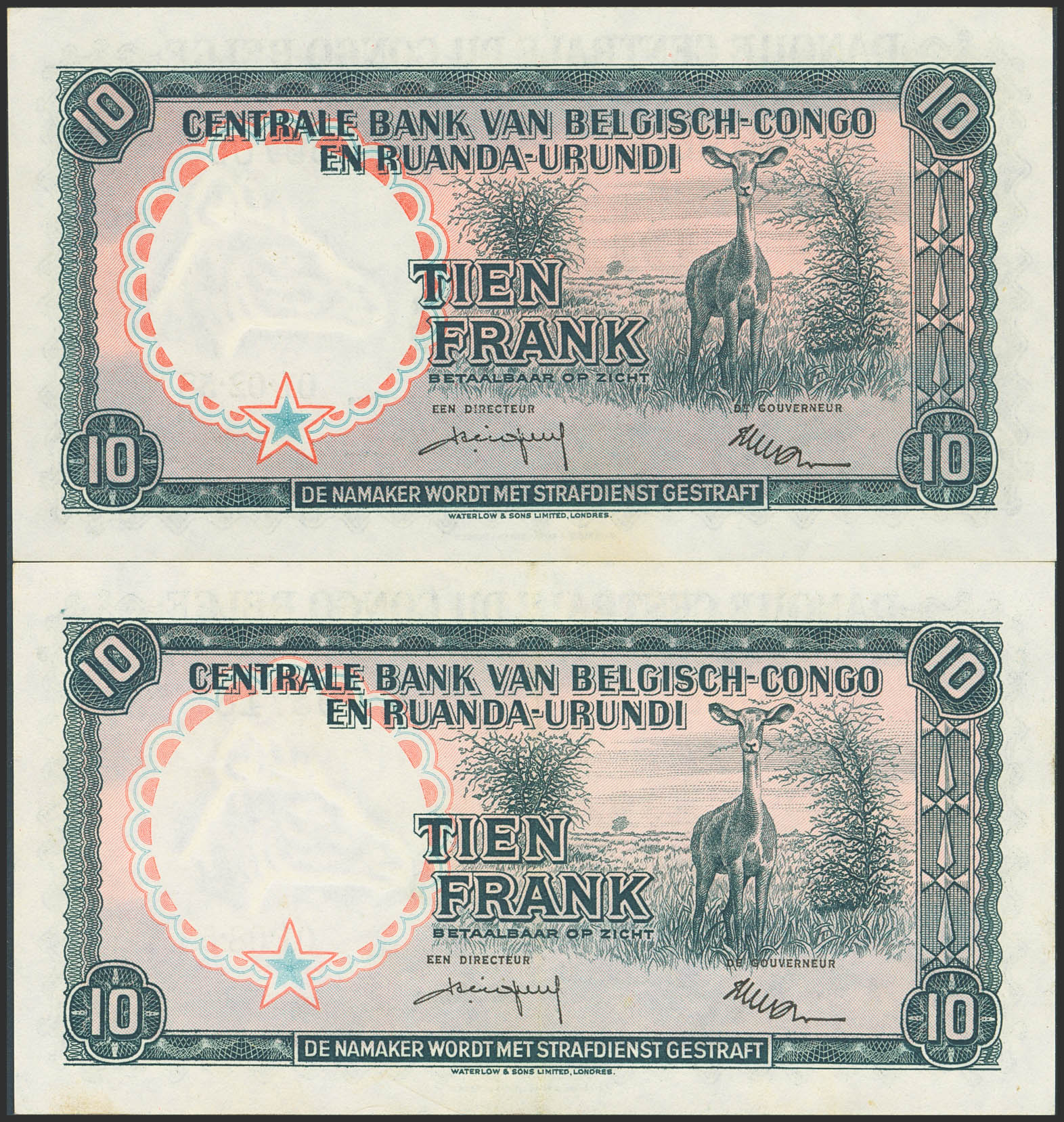 BELGIAN CONGO. Lot of 2 notes of 10 Francs. 1958. Banque Centrale du Congo Belge et du Ruanda-Urundi. (Pick: 30b). Almost Uncirculated and More than Extremely Fine.