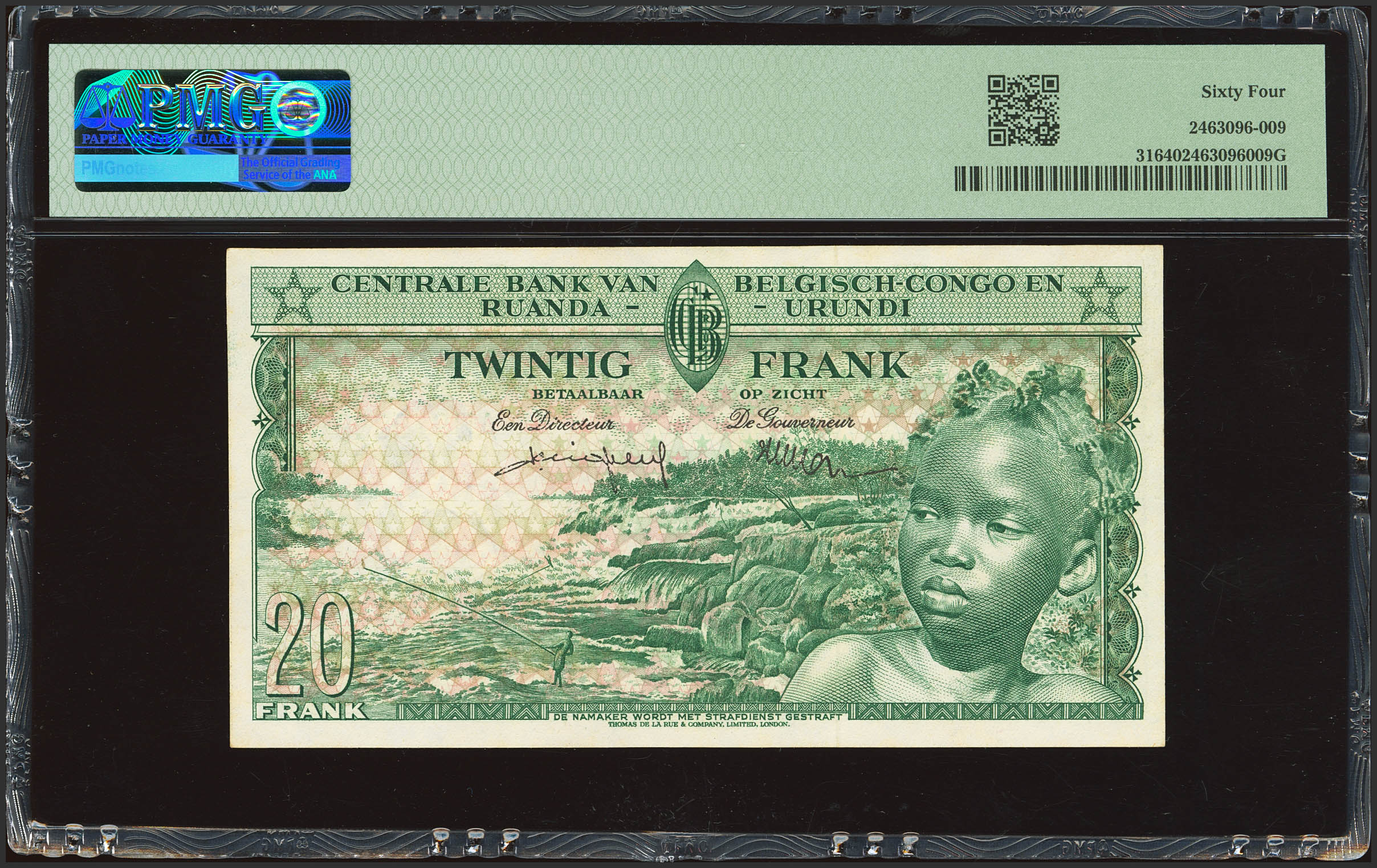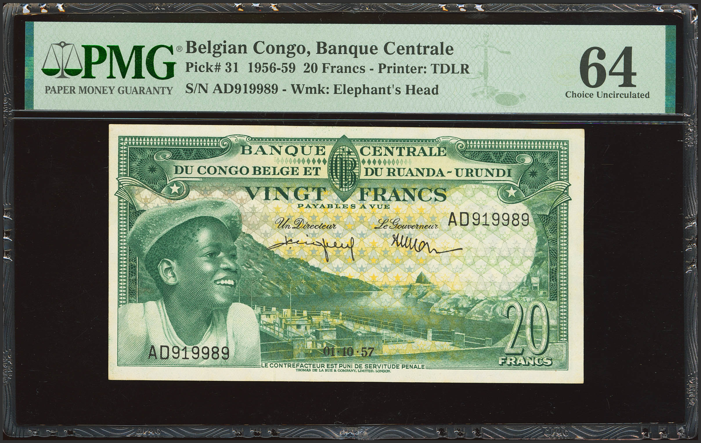 BELGIAN CONGO. 20 Francs. 1 October 1957. Banque Centrale du Congo Belge et du Ruanda-Urundi. (Pick: 31). PMG64.