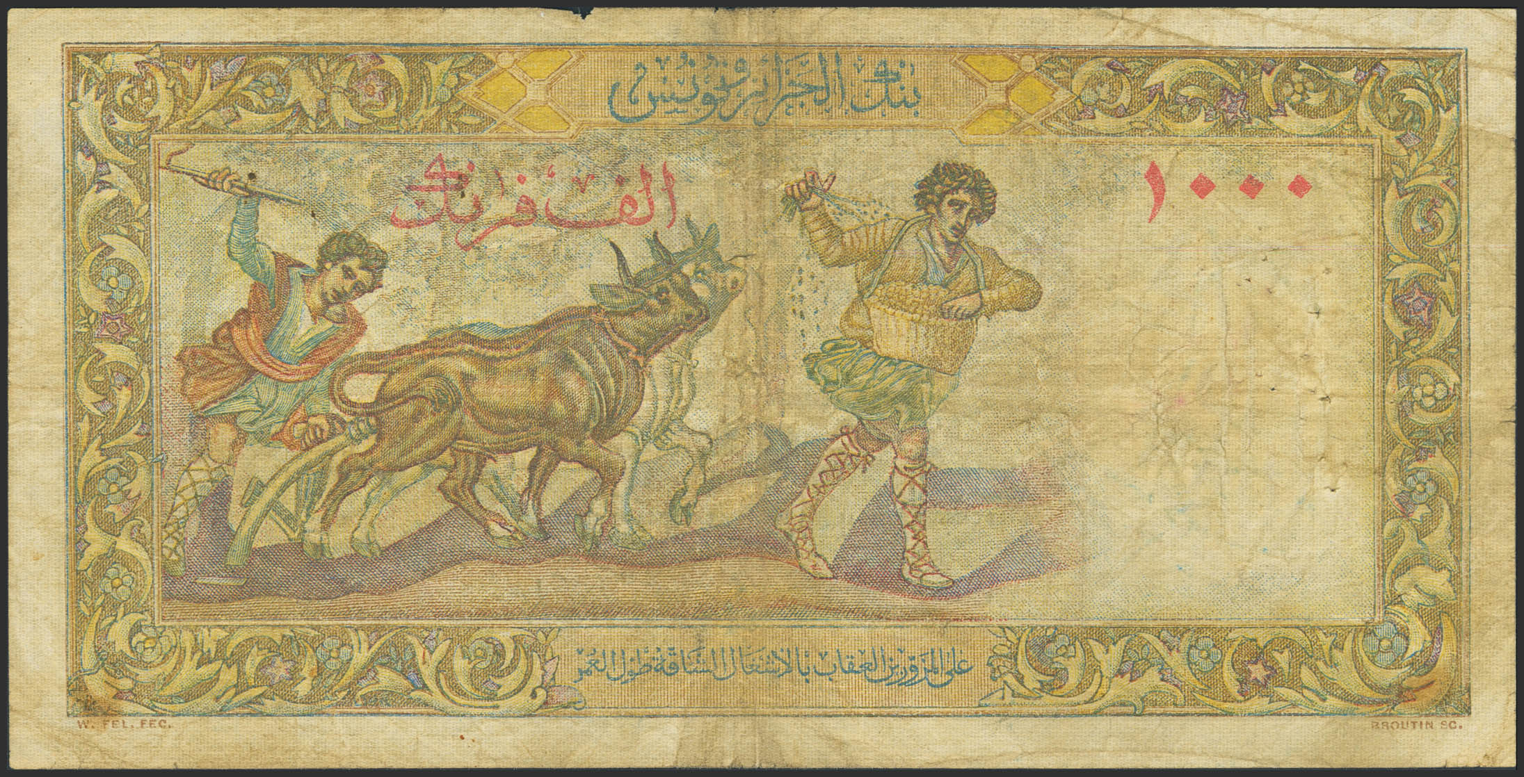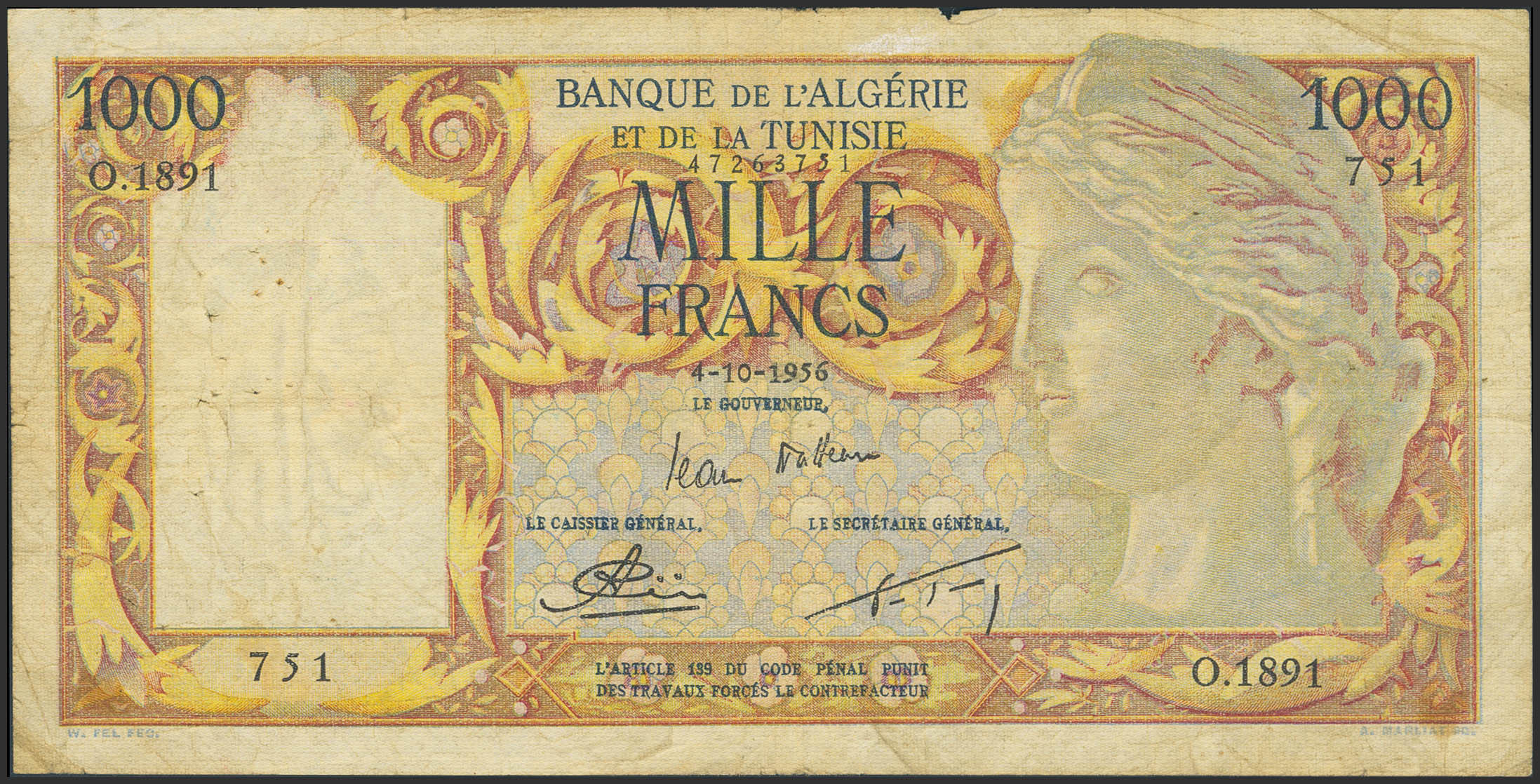 ALGERIA. 1000 Francs. 4 October 1956. Banque de l'Algerie et de la Tunisie. (Pick: 107b). Pinholes, tear. Fine.