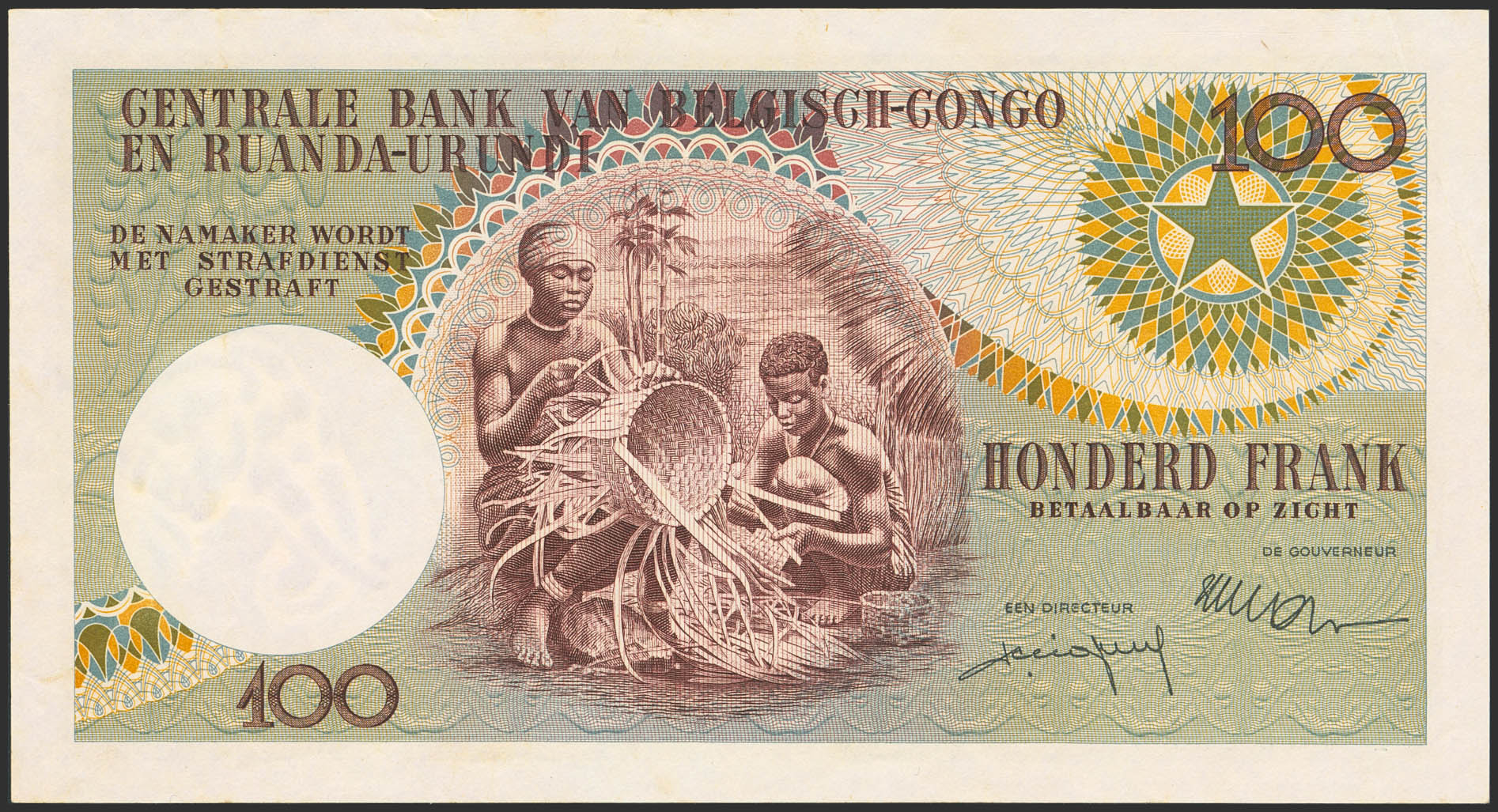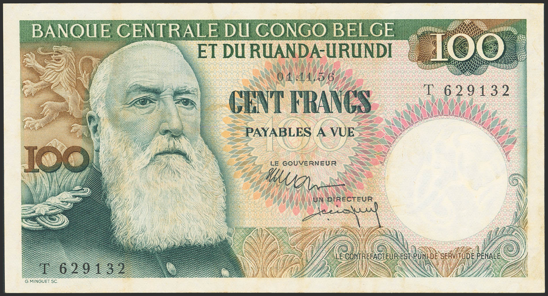 BELGIAN CONGO. 100 Francs. 1 November 1956. Banque Centrale du Congo Belge et du Ruanda-Urundi. (Pick: 33b). Extremely Fine.