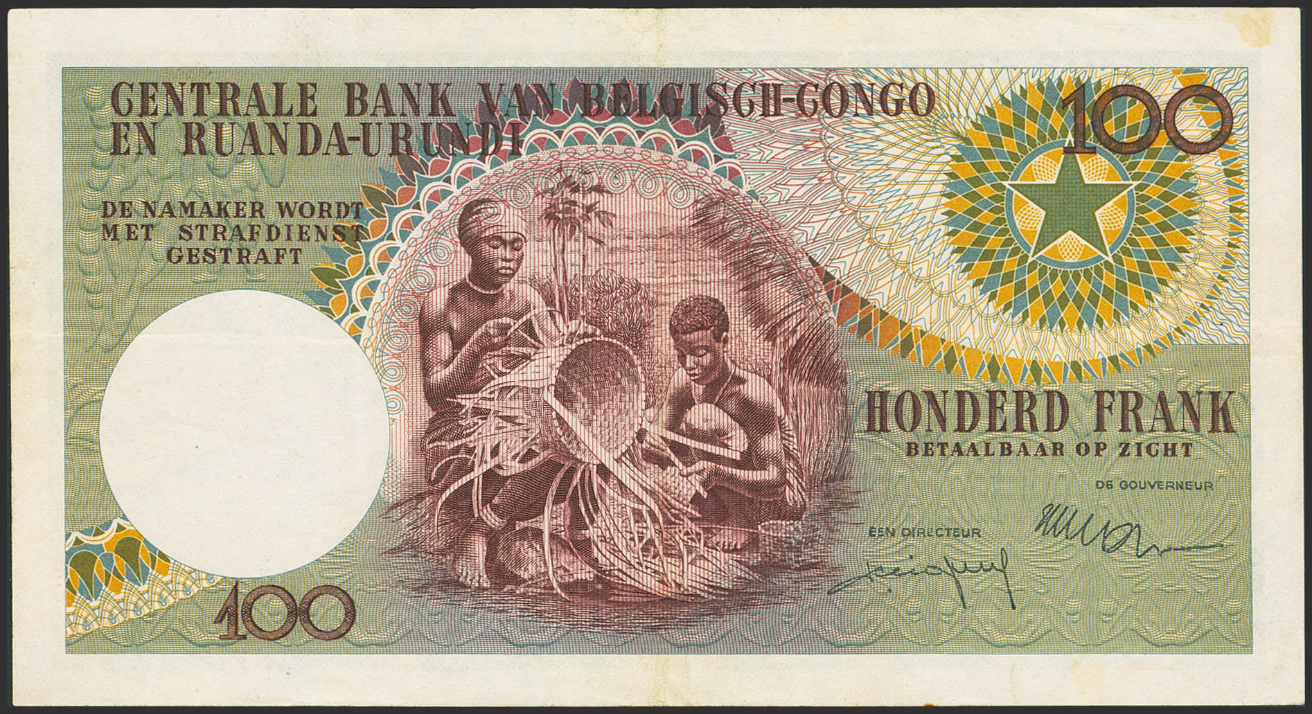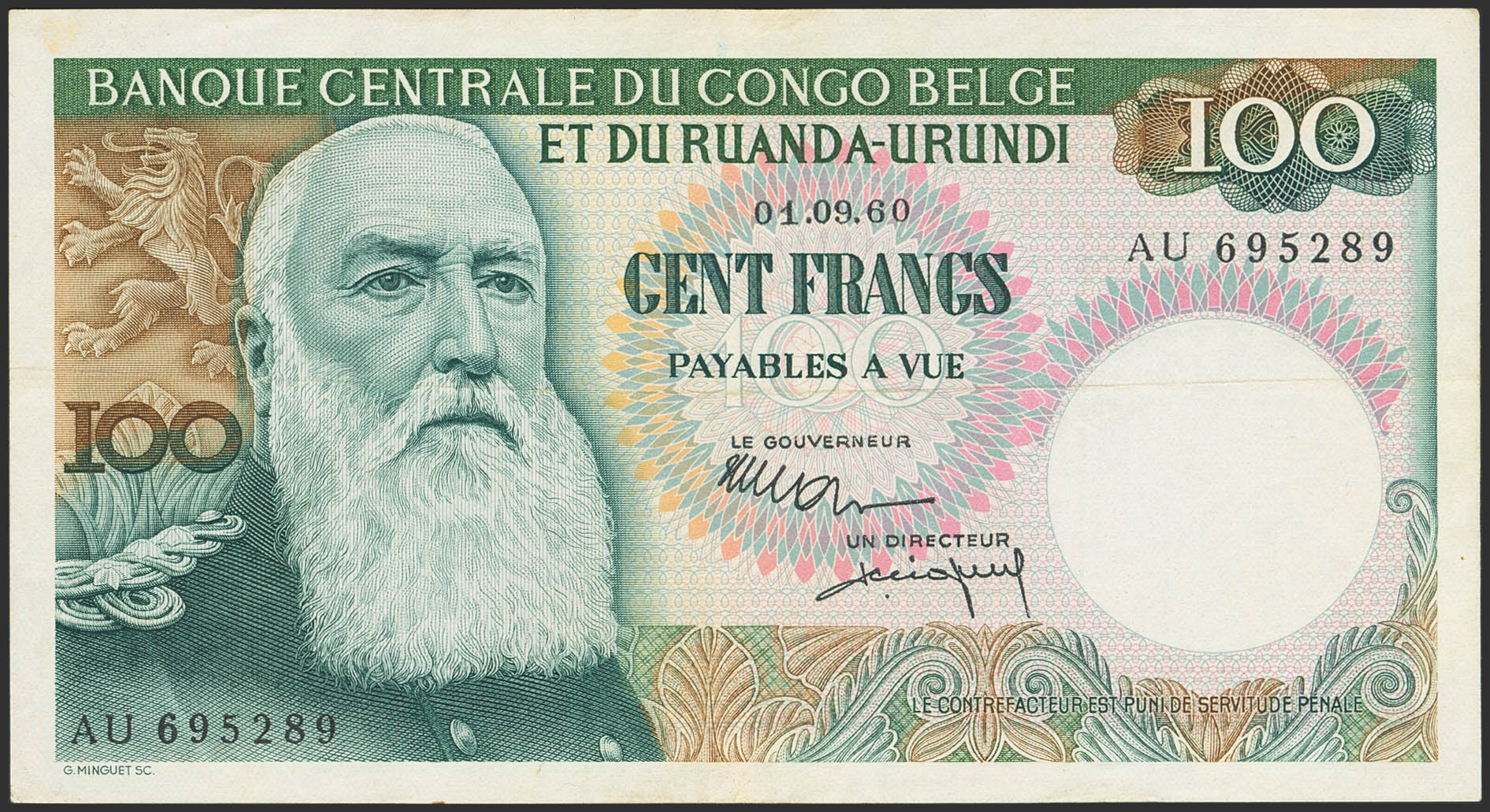 BELGIAN CONGO. 100 Francs. 1 September 1960. Banque Centrale du Congo Belge et du Ruanda-Urundi. (Pick: 33c). More than Very Fine.