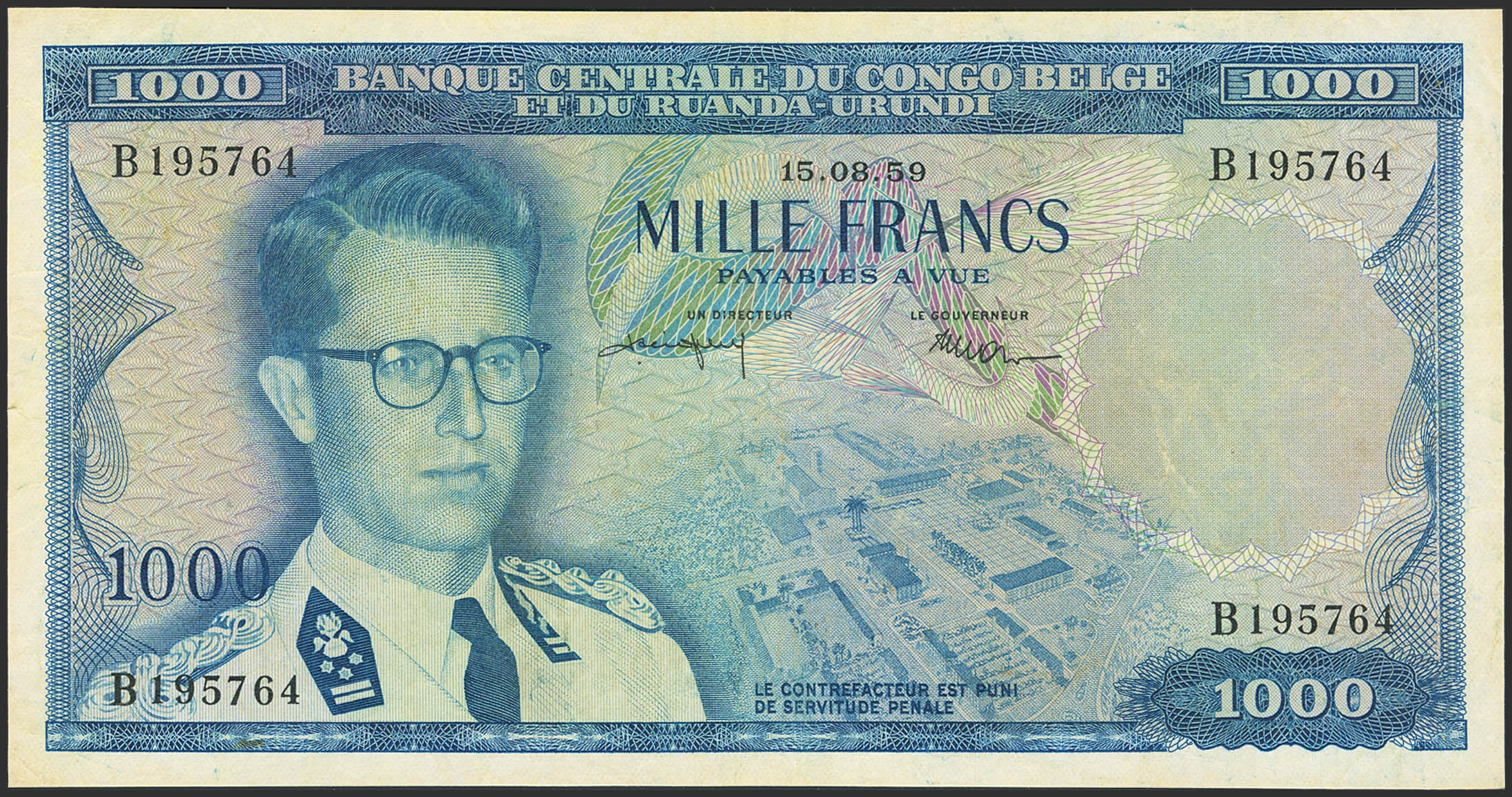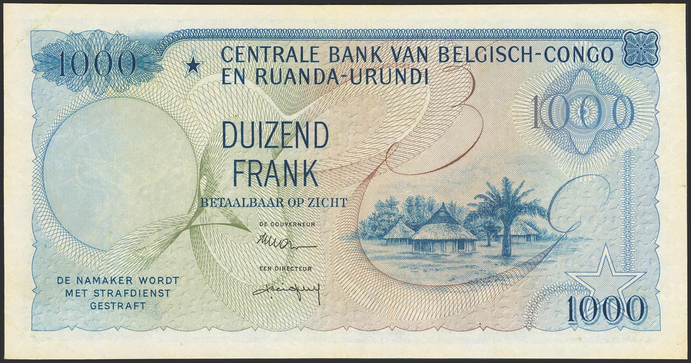 BELGIAN CONGO. 1000 Francs. 15 August 1959. Banque Centrale du Congo Belge et du Ruanda-Urundi. (Pick: 35). Washed and flattened. Very Fine.