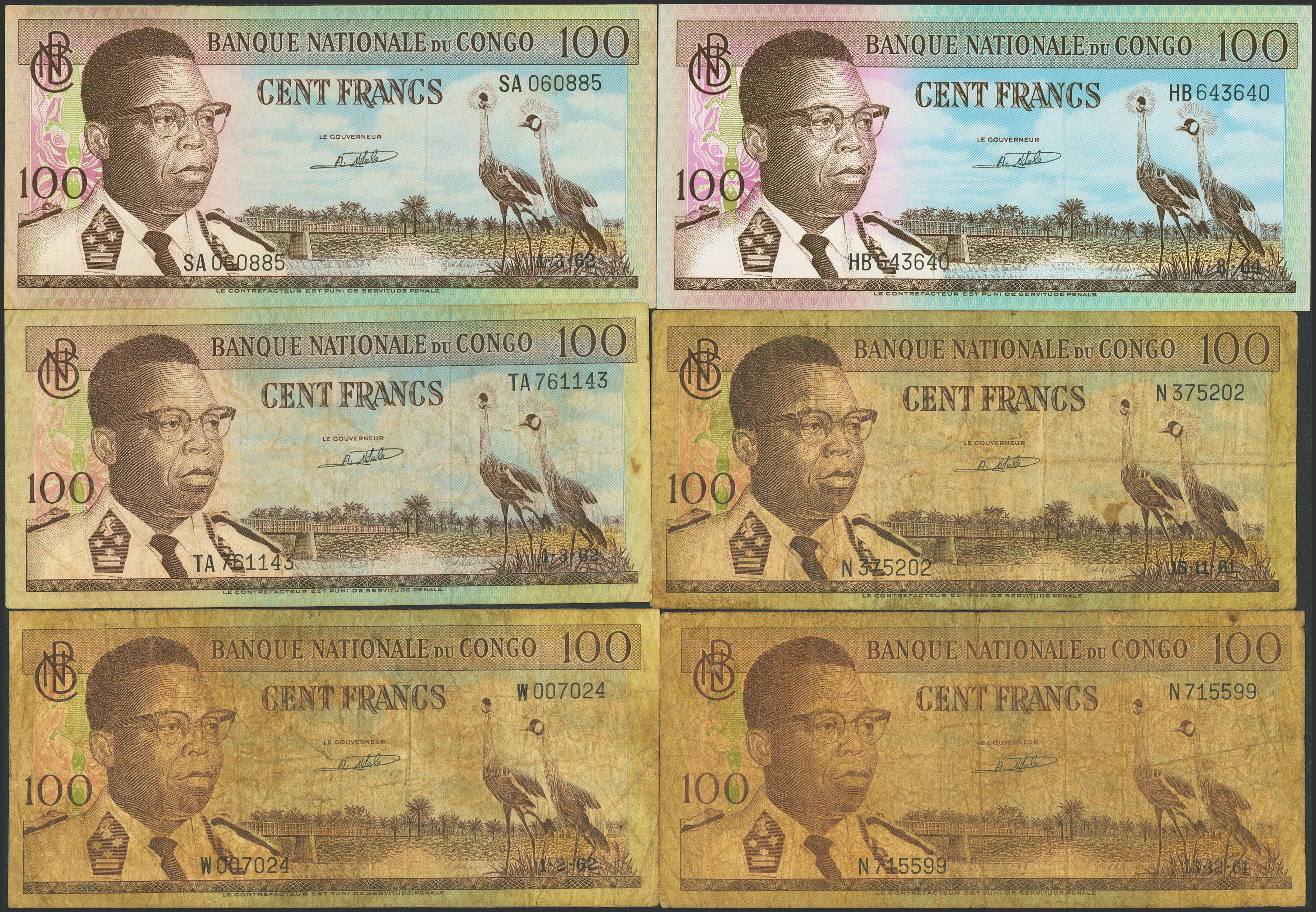 CONGO DEMOCRATIC REPUBLIC. Lot of 6 notes of 100 Francs. 1961 to 1964. Banque Nationale. (Pick: 6a). Fine (4), Less than Uncirculated (1) and Uncirculated (1).