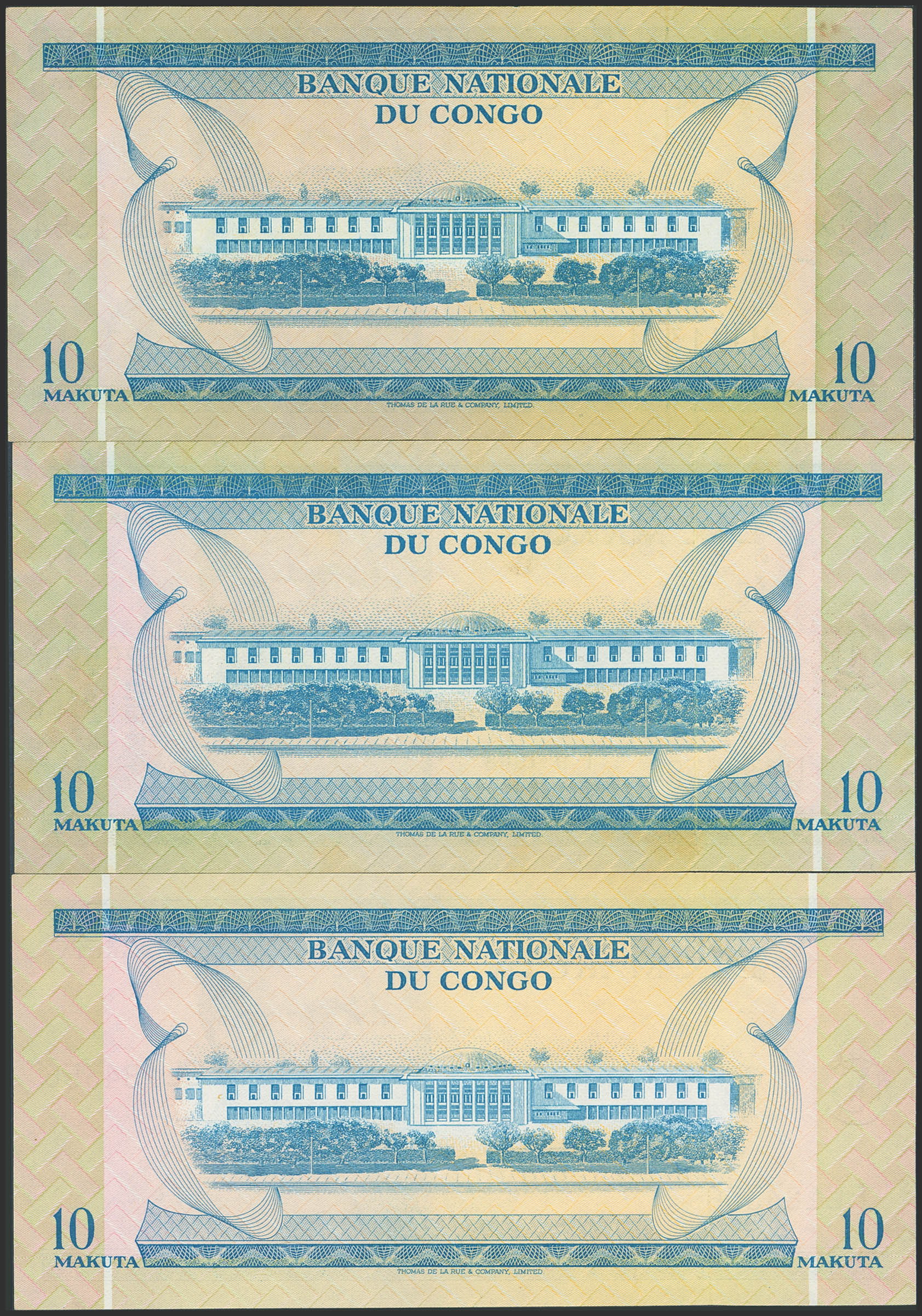 CONGO DEMOCRATIC REPUBLIC. Lot of 3 notes of 10 Makuta. 1967 to 1970. Banque Nationale. (Pick: 9a). Almost Uncirculated (2) and Uncirculated (1).