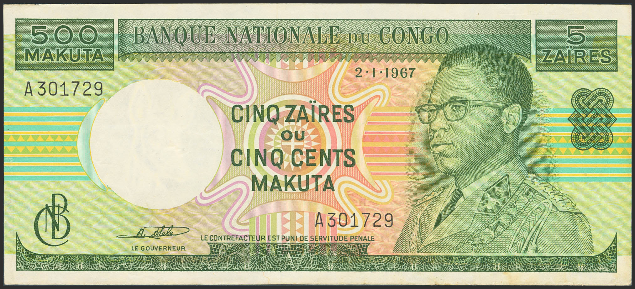 CONGO DEMOCRATIC REPUBLIC. 5 Zaires. 2 January 1967. Banque Nationale. (Pick: 13a). Dirty lower edge. Extremely Fine.