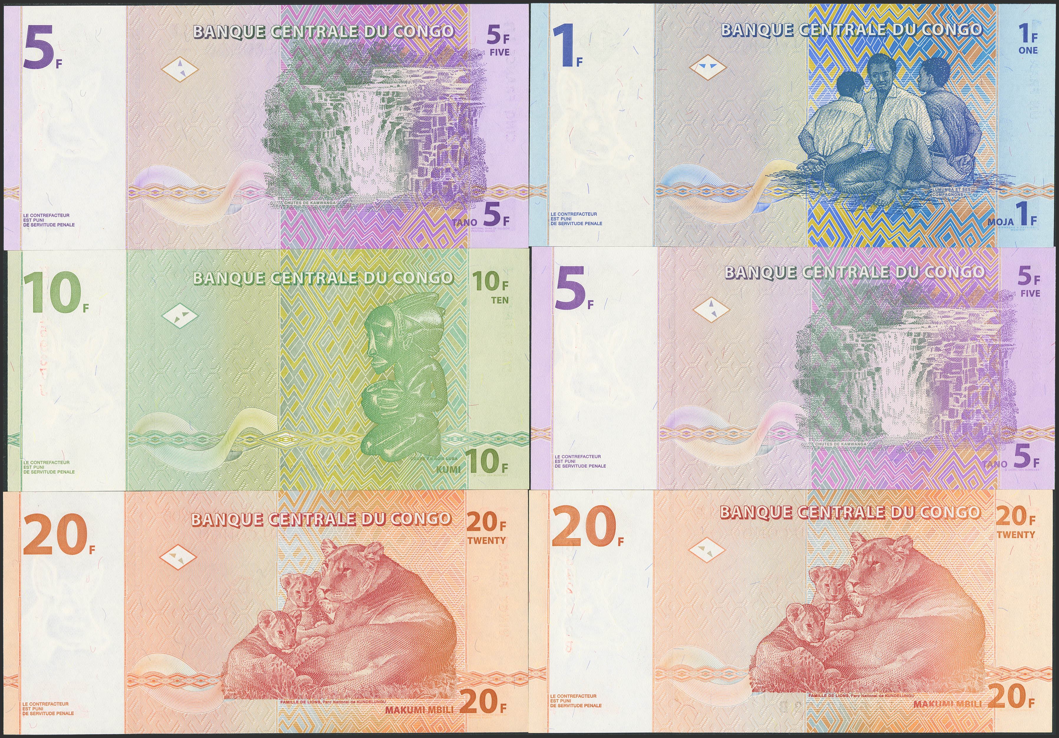 CONGO DEMOCRATIC REPUBLIC. Lot of 6 notes from 1 to 100 Francs. 1 November 1997. Banque Centrale. (Pick: 85, 86, 86A, 87, 88, 88A). Uncirculated.