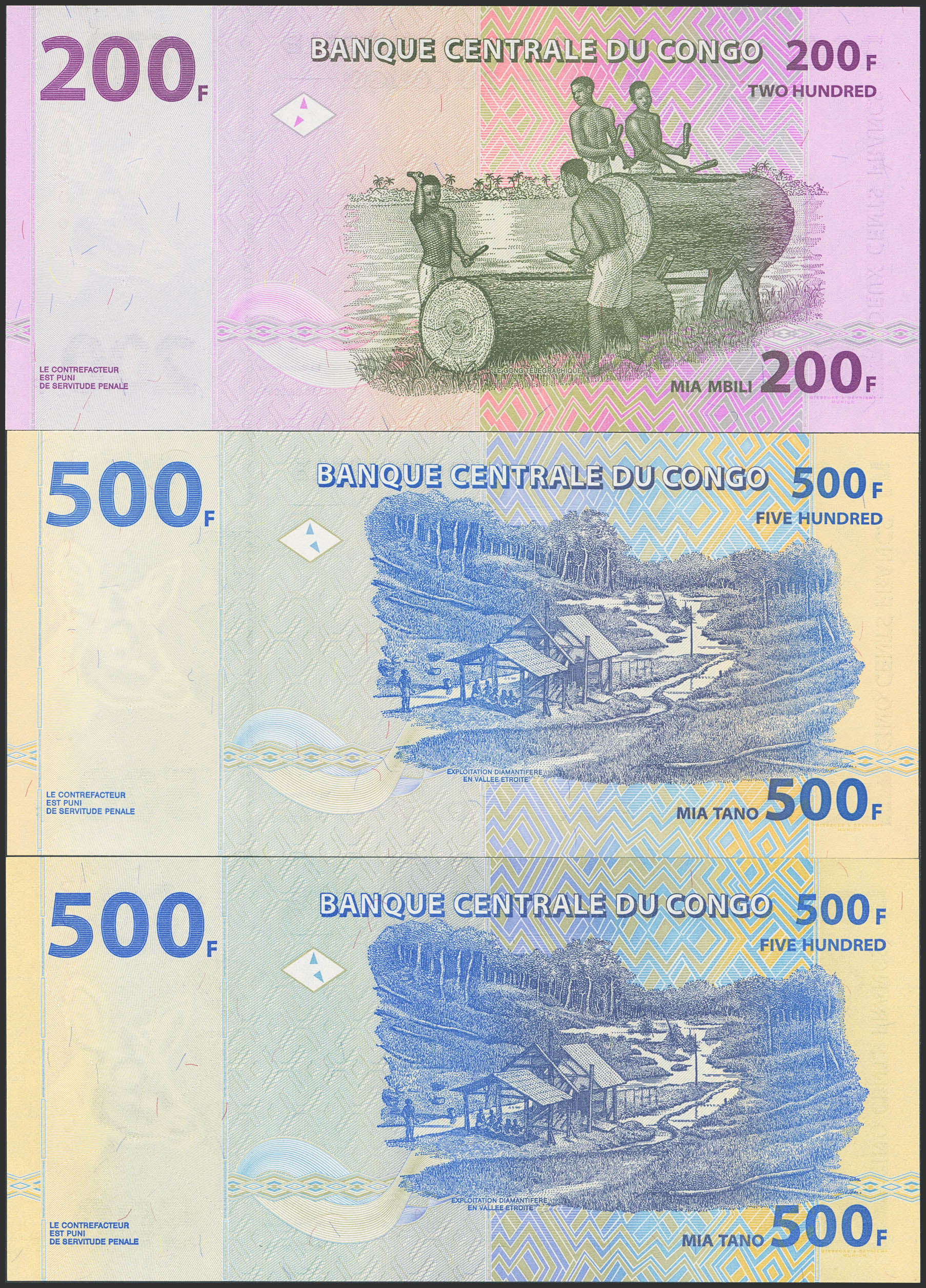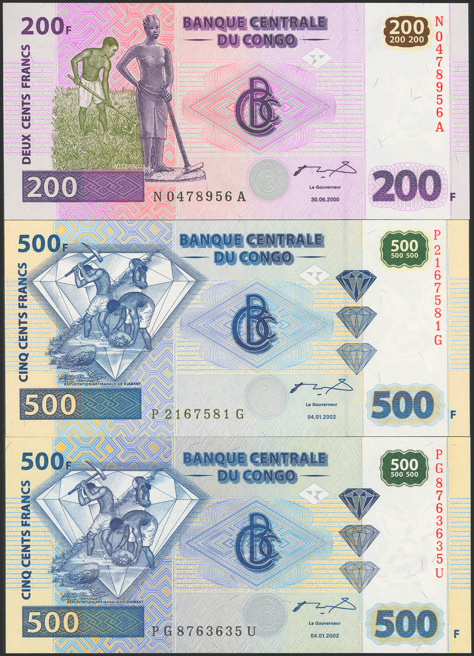 CONGO DEMOCRATIC REPUBLIC. Lot of 3 notes of 200 and 500 Francs. 30 June 2000 and 4 January 2002. Banque Centrale. (Pick: 95a, 96a). Uncirculated.
