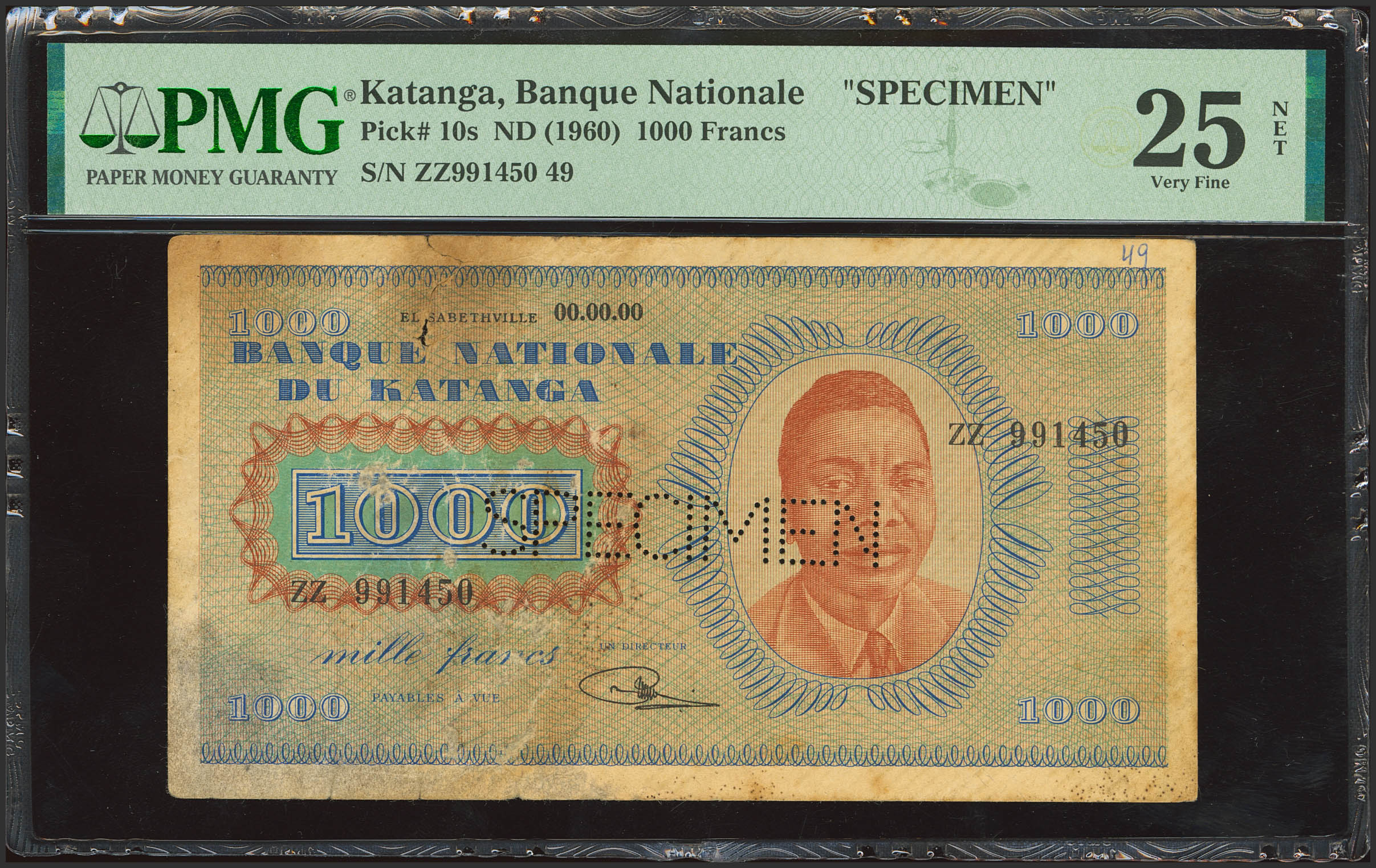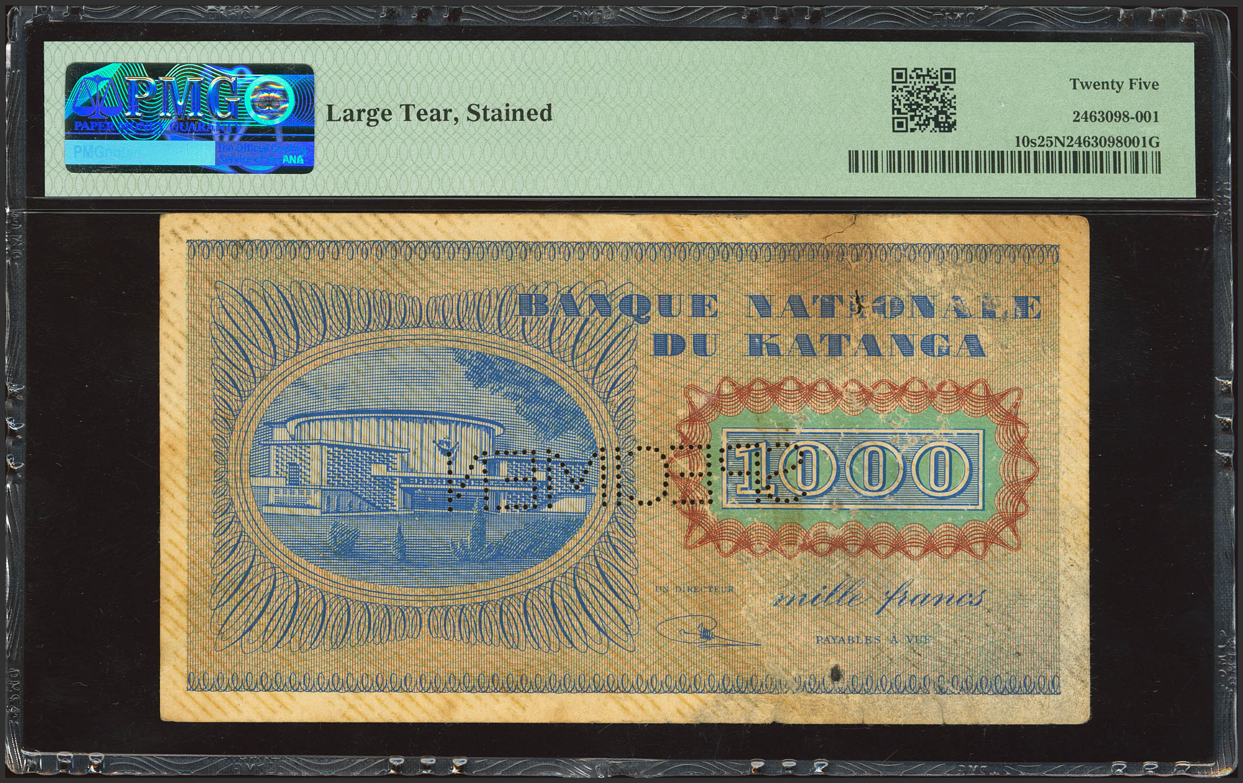 CONGO-KATANGA. 1000 Francs. 31 October 1960. Banque Nationale. Specimen. (Pick: 10s). PMG25NET (large tear, stained).