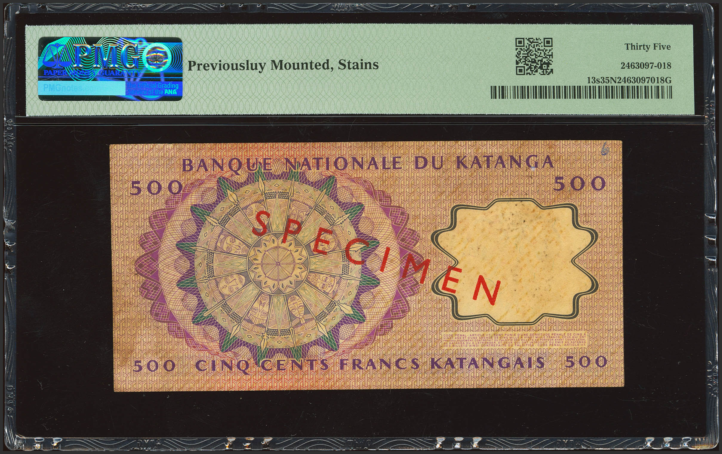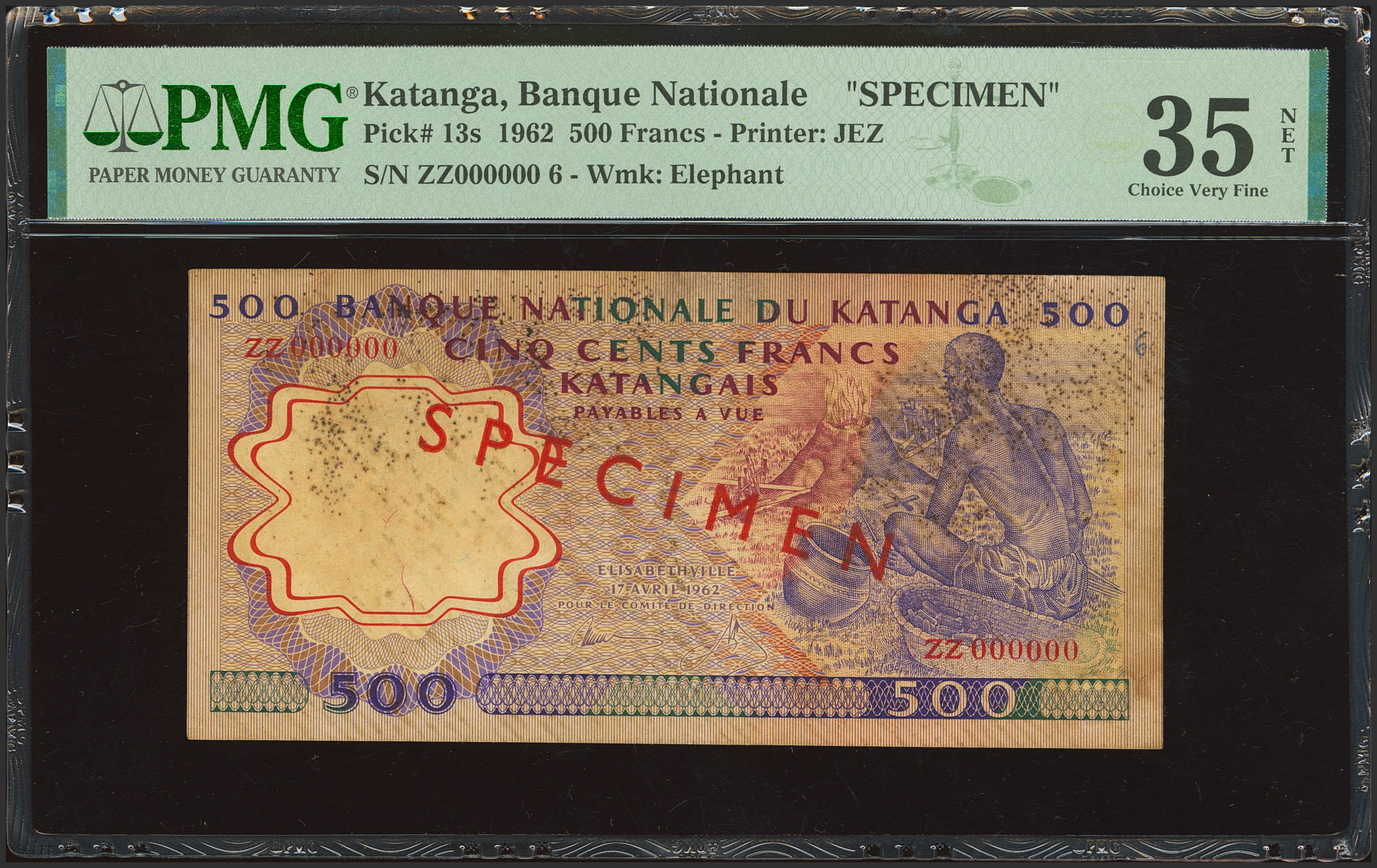 CONGO-KATANGA. 500 Francs. 17 April 1962. Banque Nationale. (Pick: 13s). PMG35NET (previously mounted, stains).