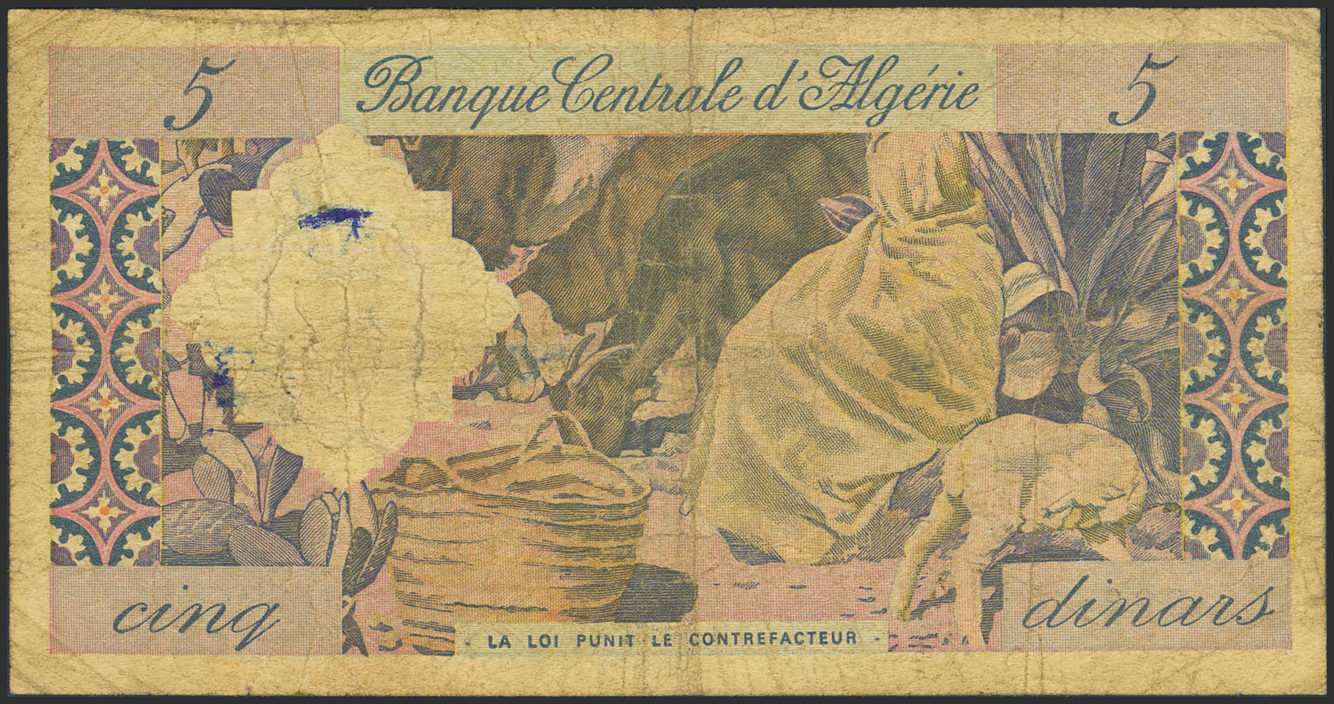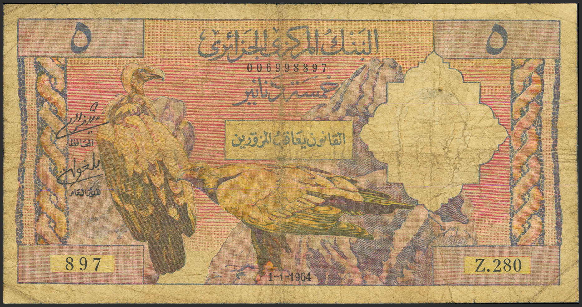 ALGERIA. 5 Dinars. 1 January 1964. Banque Centrale d'Algerie. French block style. (Pick: 122a). Pinholes. Very Good.