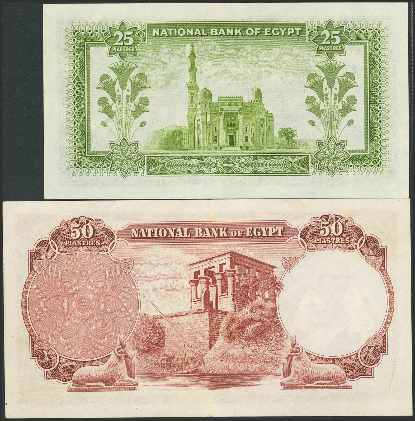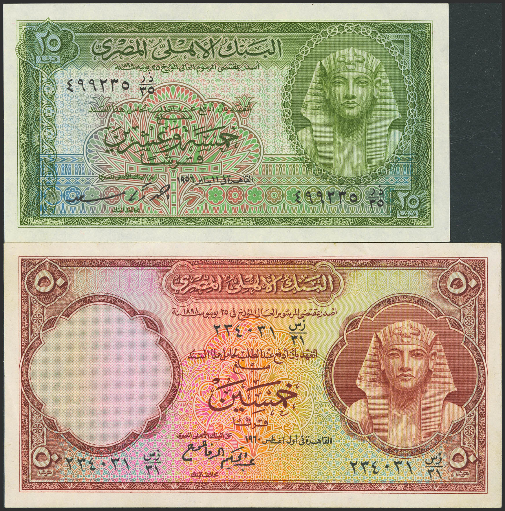 EGYPT. Lot of 2 notes of 25 and 50 Piastres. 1956 and 1960. National Bank. (Pick: 28, 29). Less than Uncirculated with handling marks (p28) and More than Extremely Fine (p29).