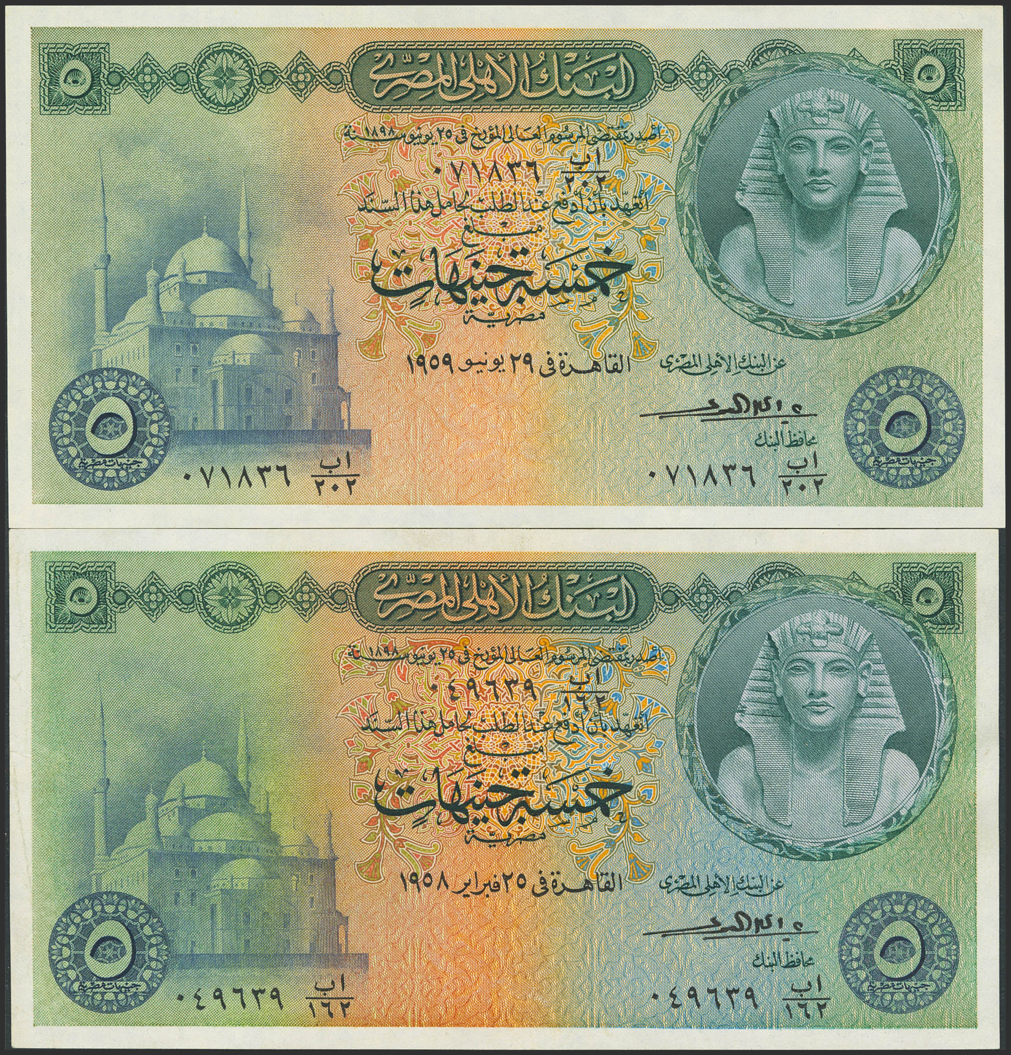 EGYPT. Lot of 2 notes of 5 Pounds. 1957 and 1959. National Bank. (Pick: 31). Almost Uncirculated.